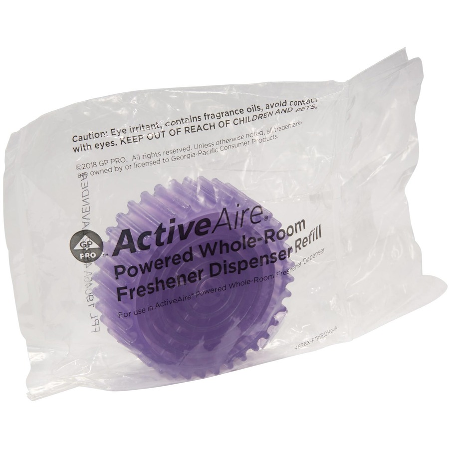 | Marketing Information | <p>Designed for Georgia Pacific ActiveAire Powered Whole-Room Freshener Dispensers, these air freshener refills help stop odors and enhance the restroom experience for all with its pleasantly scented, odor-neutralizing formula. Sustained release provides freshness for at least 30 days. Easy access allows easy maintenance. Lavender scent is a soothing, springlike, floral-fruity fragrance infused with apple, cucumber and violet, softened by powdery undertones. Urinal screens (not included) are available in a matching scent so you can be confident your restrooms will provide a consistent and more welcoming experience. Air freshener refills are compliant for VOC content with applicable federal and state regulations. No liquids or sprays are used. Refills belong to Georgia-Pacific's Take Back Program for recycling.</p> |