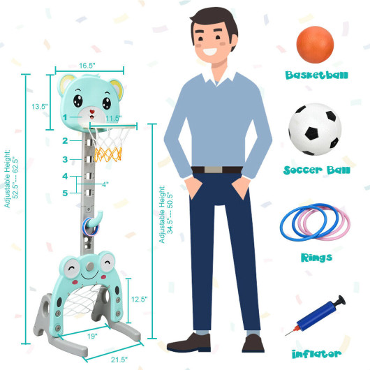 - 3-in-1 Activity Center: This basketball stand includes 3 activities: playing basketball throwing circles and playing football. Including 1 basketball 1 football 4 rings and 1 inflator kids can start playing basketball right away and have fun. It also allows kids to play together to exercise their competitiveness and team spirit.