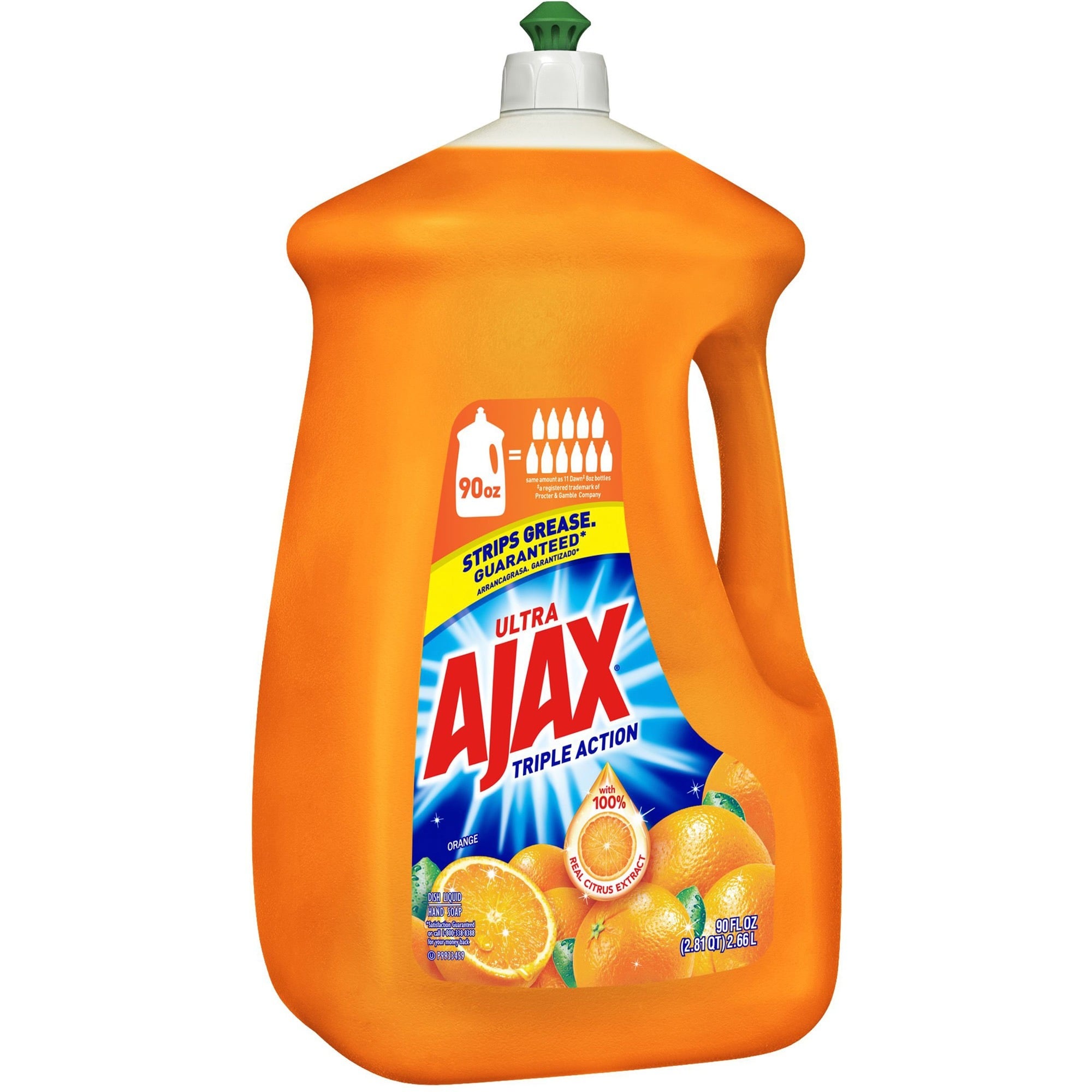 | Marketing Information | <p>Ajax Triple Action Orange Dish Liquid provides a pleasant and powerful cleaning experience with the lively scent of oranges while leaving your dishes sparkling clean. It cuts grease to get dishes clean and spotless. Manual dish detergent also washes away bacteria on hands (when used as a hand soap, to wash away dirt and bacteria from hands, wash them for 20 seconds under clean running water) and fights odor on dishes. This dishwashing liquid is kosher and phosphate-free.</p> |