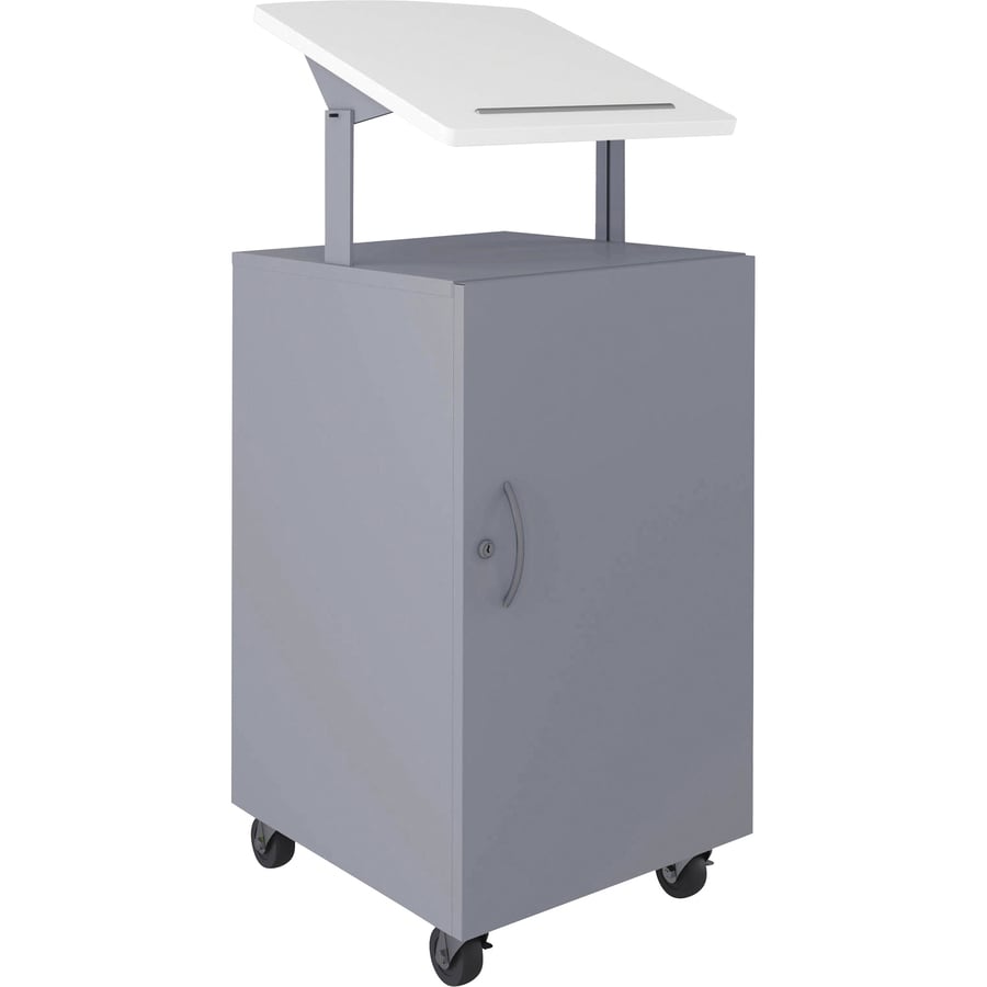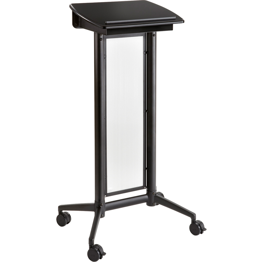 | Marketing Information | <p>Multimedia Computer Lectern features a slide-out locking shelf for your keyboard and two locking doors to provide secure storage for equipment. Use the slide-out locking shelf for projectors and adjustable inner shelf for computer and AV material. Adjustable shelf measures 24" wide x 17-1/2" deep. The lectern is equipped with wire-management grommets for easy cord management and four heavy-duty hidden casters for easy movement from one presentation location to the next. Two casters lock for a stability. Design includes high-quality laminate heat-fused with stained pine wood finish, radius corners, skirted base and rounded top sculpted top profile.</p> |