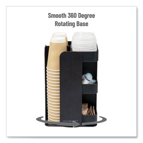Organization is essential in any kitchen, especially in the workplace or hotel. Keep your disposable cups, lids and condiments neat and tidy on any countertop with this 8-compartment carousel. Each cup compartment can hold 25 to 30 cups depending on the size. It fits 10 oz, 12 oz and 16 oz disposable cups. There are six compartments for lids, sweeteners and creamers. This caddy is designed for high-traffic areas where people need to access cups, lids and condiments. Keep your hotel patrons happy by placing it near your coffee station. It’s also a great gift for students in college who need endless cups for their late nights of studying. Plan ahead for your next party and buy this for the coffee station so everyone can help themselves to a hot beverage and keep the party going. Ideal for indoor or outdoor use, the plastic cup, lid and condiment holder is both neutral and modern. If an accidental spill happens or dust accumulates, clean this eight-compartment rotating carousel with mild soap and a paper towel or soft cloth.