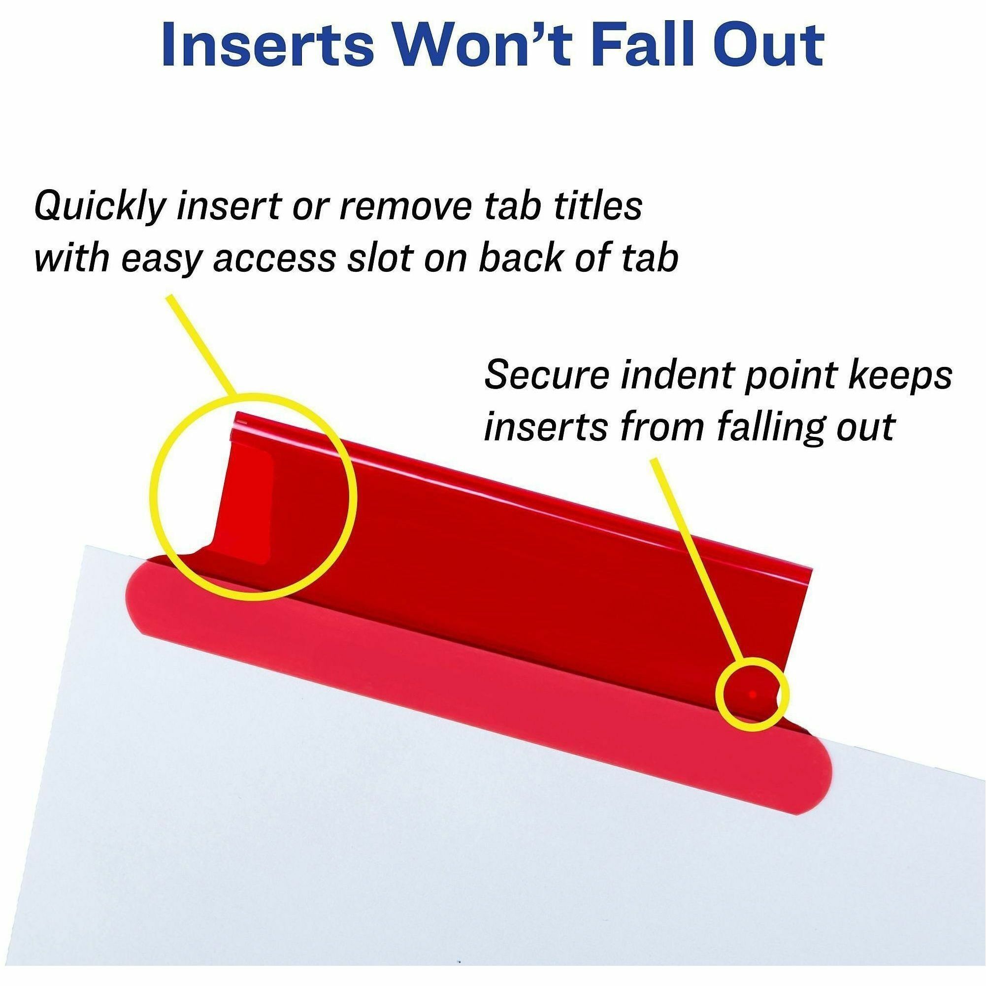 | Marketing Information | Dividers feature a special tab design so inserts are secure yet easy to insert and remove. Big tabs and inserts provide 50 percent more printing space for tab titles than traditional, insertable tab dividers. Dividers feature extra-wide white paper and single-sided, clear-reinforced edges. Avery offers many easy-to-use templates for Microsoft Word and other popular software programs. Create and update tab inserts using your laser or inkjet printer. <p><a id="gfk-spex-minisite" rel="nofollow" href="javascript:void(0)" onclick="javascript:window.open('//content.etilize.com/mini-site/en_us/1016059728.html', '_blank', 'height=800, width=780, resizable=yes, scrollbars=yes, toolbar=no, menubar=no, location=no, directories=no, status=no'), return false, ">More from the Manufacturer</a></p> |