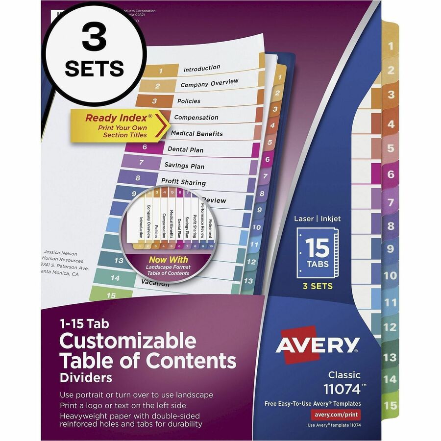 Avery® Customizable Table of Contents Dividers, Ready Index(R) Printable Section Titles, Preprinted 1-15 Multicolor Tabs, 3 Sets (11074) – 45 x Divider(s) – 1-15 – 15 Tab(s)/Set – 8.5″ Divider Width x 11″ Divider Length – 3 Hole Punched – White Paper Divider – Multicolor Paper Tab(s) – 24 / Carton