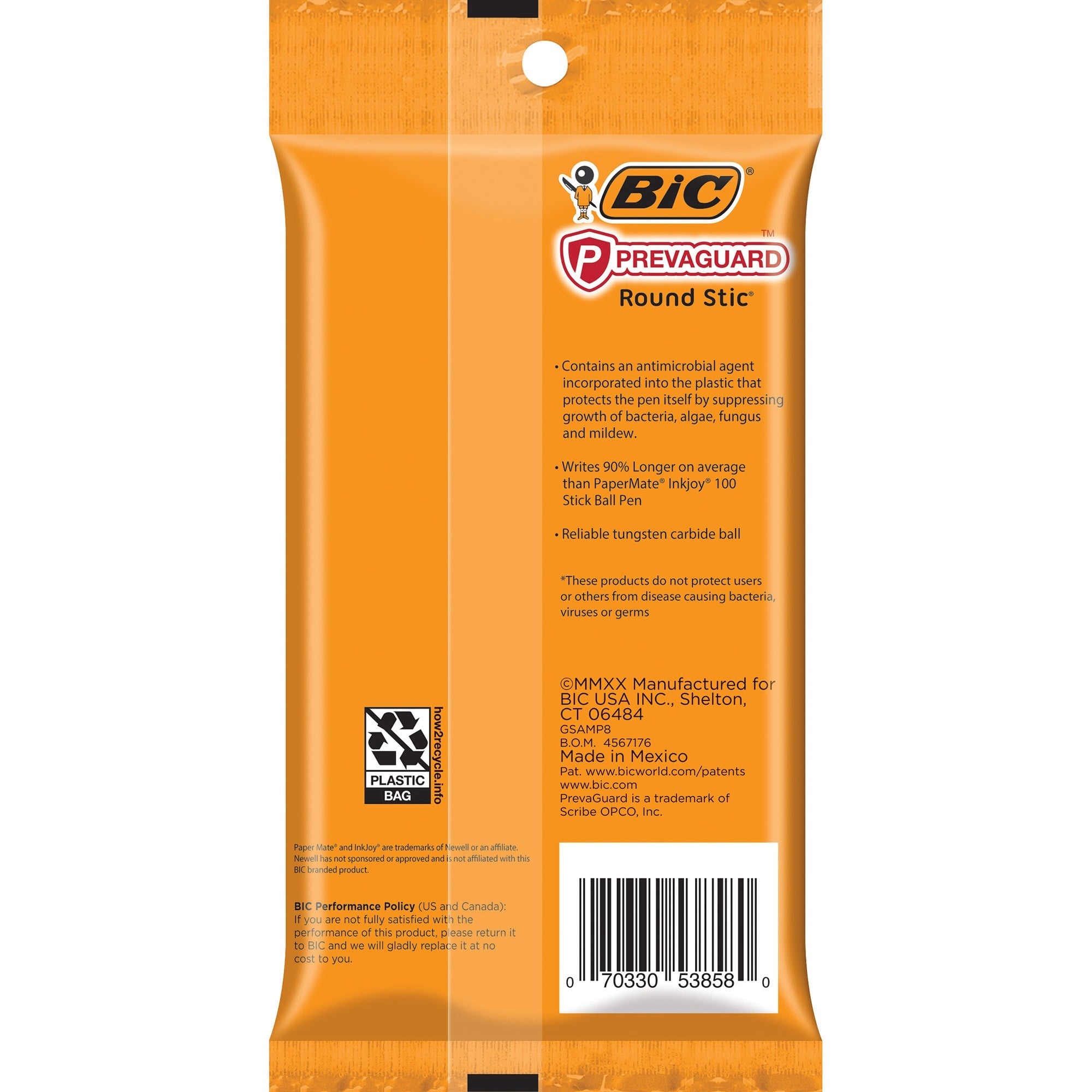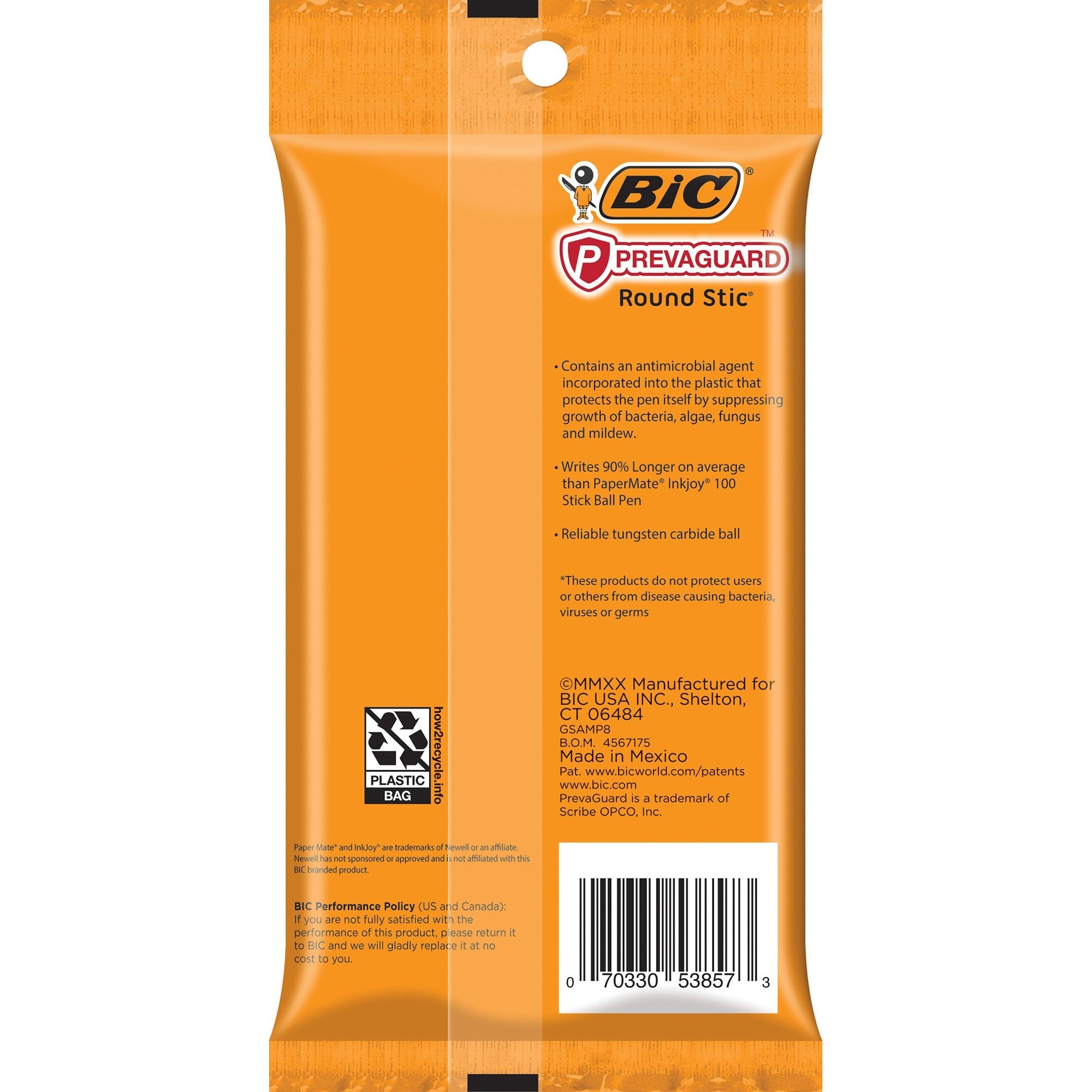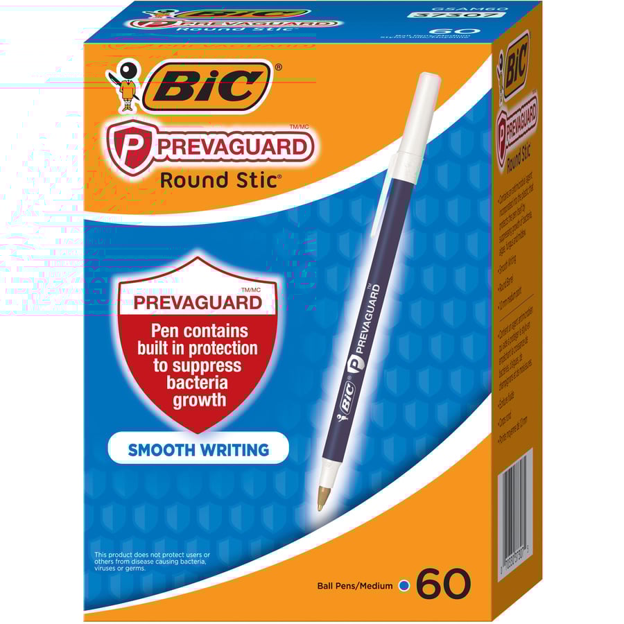 | Marketing Information | <p>BIC PrevaGuard Round Stic Ballpoint Pen contains built-in protection on the pencil to suppress bacteria growth. EPA-registered antimicrobial agent is molded directly into the pencil. This helps protect the pen by suppressing the growth of bacteria, molds, mildew and fungi, especially in high-moisture environments. Lasting for the life of the plastic barrel, it also enhances pencil's freshness and fights undesired odors, staining and pencil degradation. Comfortable round barrel makes it ideal for taking notes at home, school or work. Versatile, 1.0mm ballpoint makes it a go-to-winner for everyday writing.</p> |