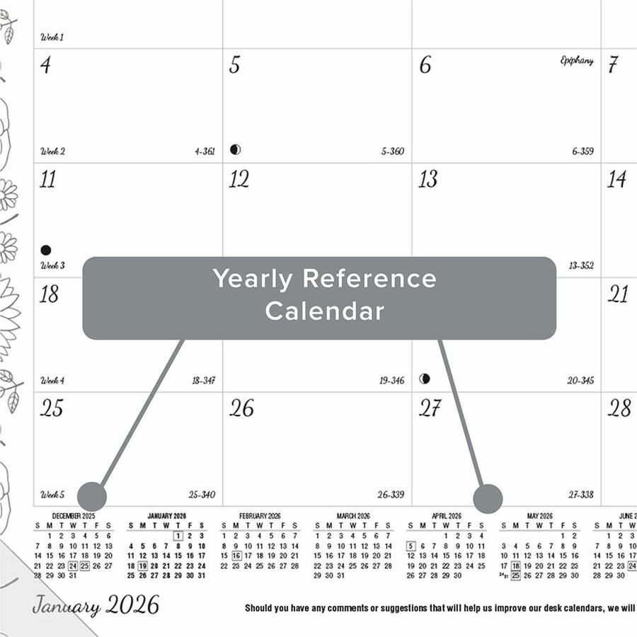 | Marketing Information | <p>Monthly desk pad features a different Botanica design for each month so you can doodle on it while at your desk. Planning pages range 12 months from January to December and are bound at the top. Each tears off easily. One-page-per-month format features daily blocks, a notes section and full-year calendar reference on the bottom of each sheet. Desk pad has a reinforced chipboard backer, two eyelets for hanging and corners to secure the bottom edges.</p> |