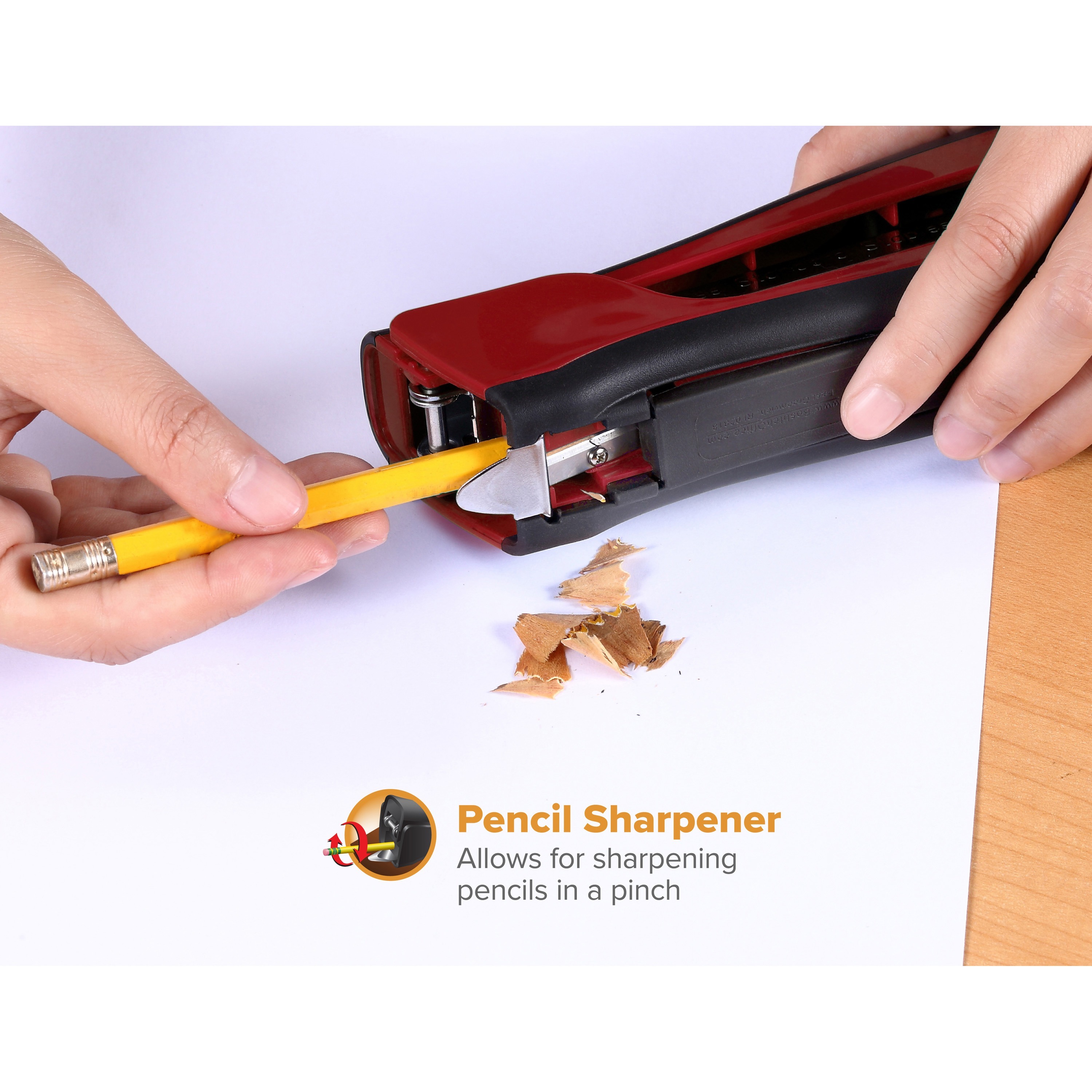 | Marketing Information | A gadget lover's dream, the Dynamo Desktop Stapler features a built-in pencil sharpener, staple remover and a StapleStore compartment that stores two extra staple strips in the base. Efficient yet lightweight, the curved silhouette complements the palm of your hand while the soft rubber grip and base provide lasting comfort – a perfect combination for frequent stapling. Stapler opens 180 degrees for bulletin board tacking and crafting. It stands vertically or horizontally for easy access and storage. Use it to staple up to 20 sheets of paper. Full-strip staple capacity accommodates 210 standard staples. <p><a id="gfk-spex-minisite" rel="nofollow" href="javascript:void(0)" onclick="javascript:window.open('//content.etilize.com/mini-site/en_us/1030264100.html', '_blank', 'height=800, width=780, resizable=yes, scrollbars=yes, toolbar=no, menubar=no, location=no, directories=no, status=no'), return false, ">More from the Manufacturer</a></p> |