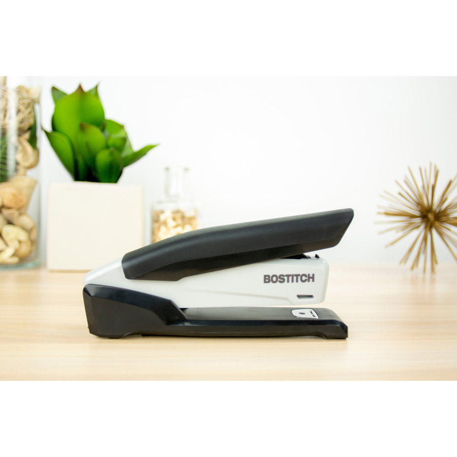Bostitch EcoStapler Spring-Powered Antimicrobial Desktop Stapler – 20 of 30lb Paper Sheets Capacity – 210 Staple Capacity – Full Strip – 1/4″ Staple Size – Gray, Black