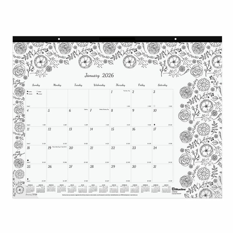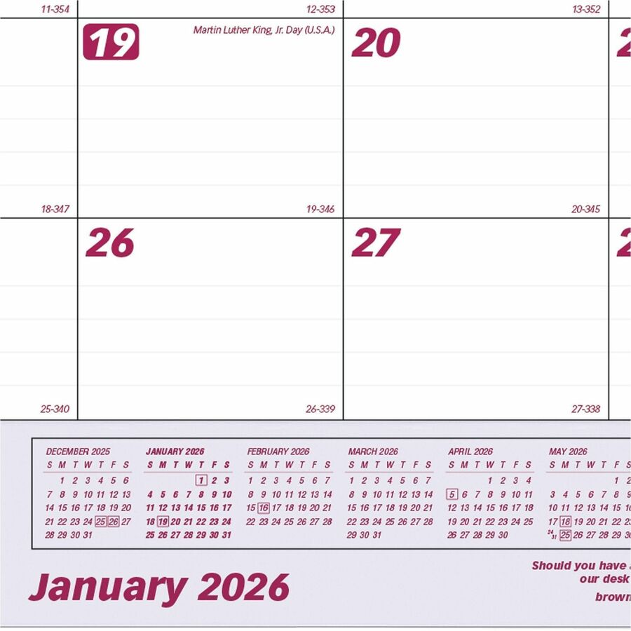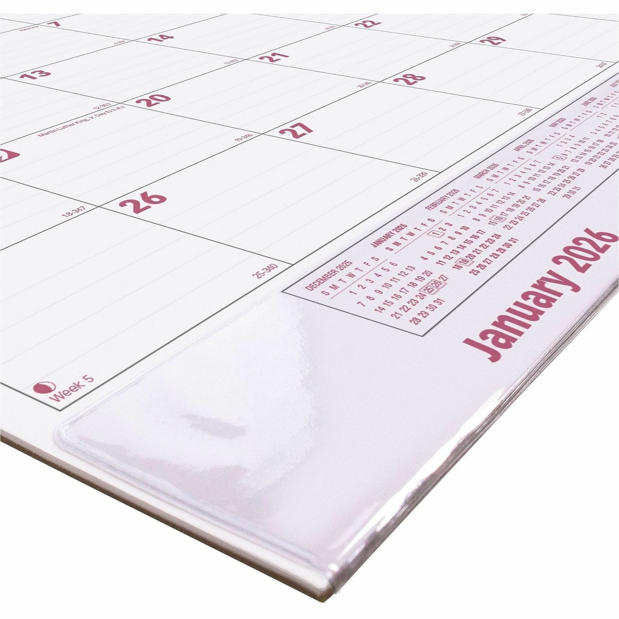| Marketing Information | <p>Monthly desk pad offers ample planning space to organize your entire month and look ahead for future planning. Clear vinyl strip at bottom protects the sheets from bending. Use the two holes at the top binding to hang this large calendar on your wall. Tear-off monthly sheets are bound and perforated for clean removal. Dated planning pages range 12 months from January to December. One-month-per-page format includes ruled daily blocks, Sunday-through-Saturday scheduling, count of days/days remaining, holidays, moon phases and a yearly calendar along the bottom. Nonrefillable pad also features a reinforced chipboard backer to protect your desk surface.</p> |