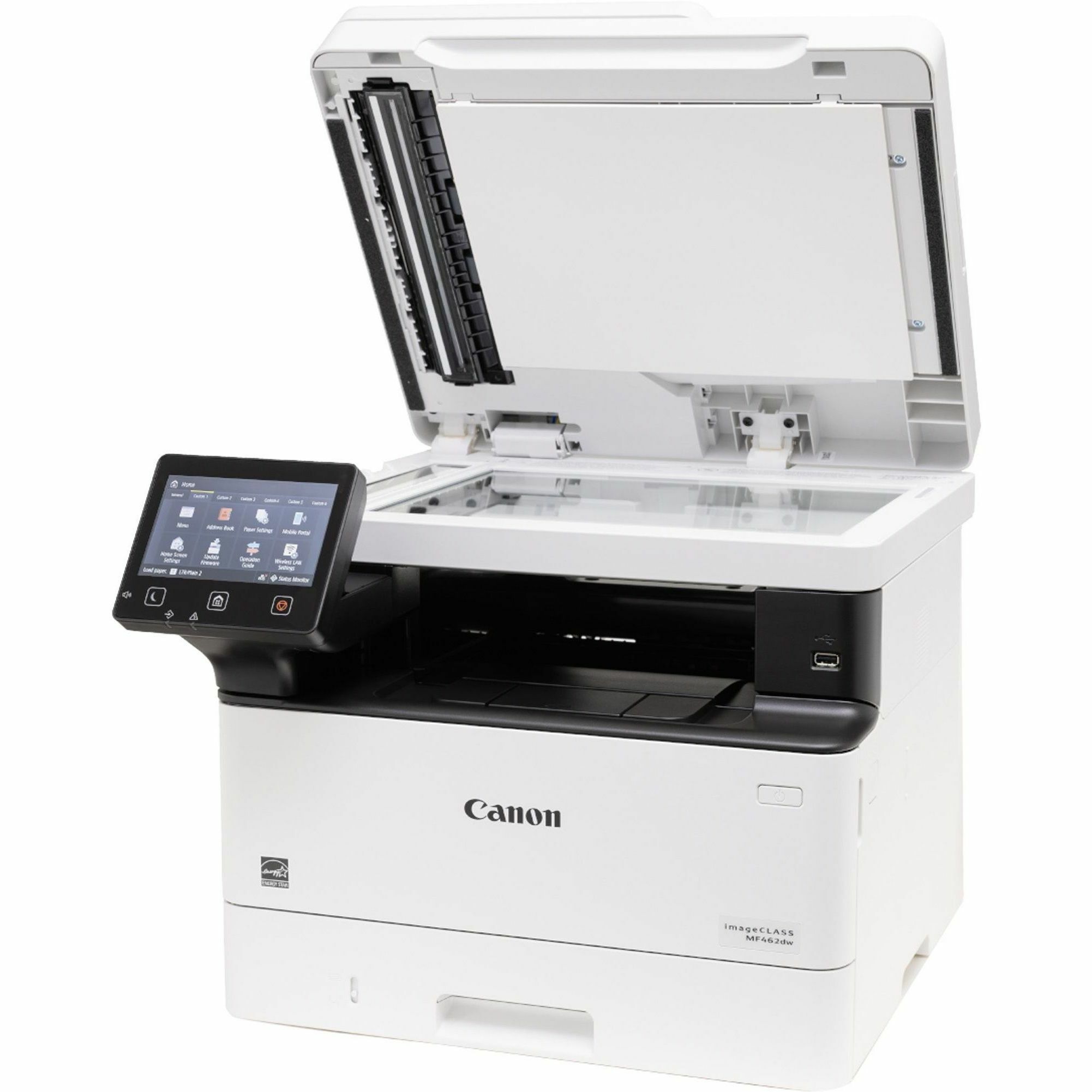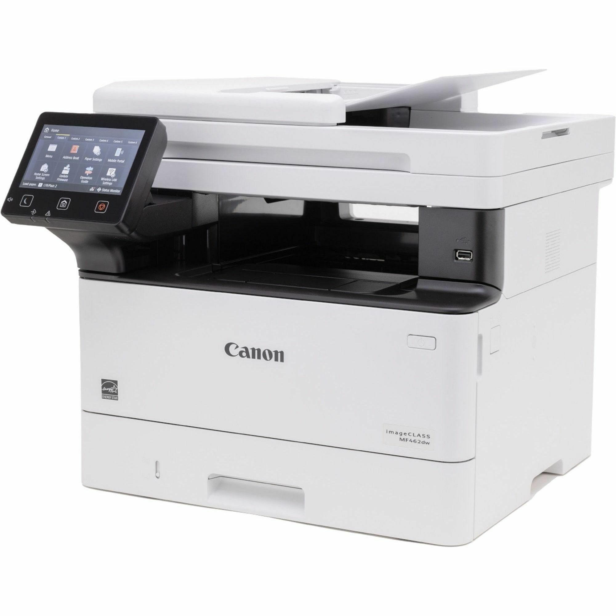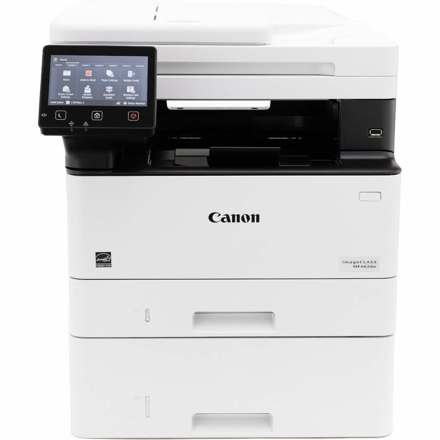 | Marketing Information | This imageCLASS MF462dw All-in-One Wireless Printer is designed for small office environments where black-and-white capability is needed and productivity, ease of use and large toner/paper capacity are priorities. Print, scan, copy and fax with the same device for optimal convenience. 50-sheet automatic document feeder (ADF) allows you to create two-sided scans. High-speed scanning scans single-sided documents as fast as 40 ipm and double-sided pages at 80 ipm. Print up to 37 ppm in resolutions up to 1200 x 1200 dpi. Printer features 250-sheet input tray, 100-sheet multipurpose tray and an optional 550-sheet paper tray (not included). Wi-Fi Direct Connection enables easy connection to mobile devices without a router. Print from your mobile device using Canon Print Business, Apple Print and Mopria Print Service apps. 5" color touch-screen LCD allows easy navigation. Connect using Wi-Fi, USB 2.0 High-Speed and Ethernet. <br /> |