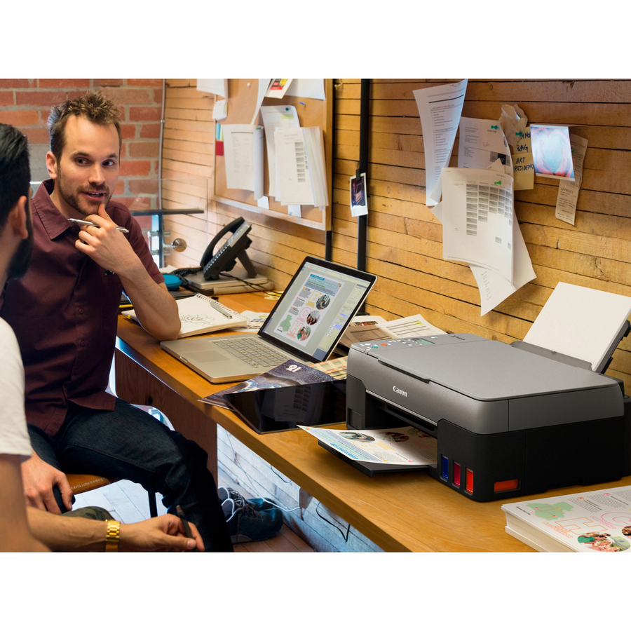 | Marketing Information | PIXMA MegaTank All-In-One Printer is fitted with refillable ink tanks and enough ink to do the work of 30 conventional ink cartridge sets. Print up to 6, 000 pages in black or 7, 700 pages in color to produce crisp blacks and rich colors with a high page yield. Estimated print speed is approximately 9.1 ipm in black and 5 ipm in color with a print resolution up to 4800 x 1200 dpi. Printer is compatible with a variety of paper sizes and types including glossy, semi-gloss and matte photo paper for borderless photo printing. Rear input tray holds up to 100 sheets of plain paper. Print and copy photos, business cards and labels. Copy up to 99 pages for optimal use. Scan documents, photos and more with a maximum optical resolution up to 600 x 1200 dpi. Effortlessly scan with the contact image sensor. Connect your Windows or Mac device using high-speed USB for quick, efficient printing. Select options using the two-line LCD. Energy-efficient printer is Energy Star certified. |