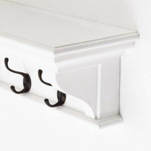 Spruce up your home with this elegant Classic White Hall Tree Coat Rack with Drawers. True to it’s name this unit has been skillfully designed to provide ample space for your coats and belongings. Standing tall with a semi glossy white paint finish, the entire unit is crafted from mahogany wood with a flared crown molding which additionally supports an ingeniously designed shelf space to store your hats or even double up as a display platform. Five antique brass hooks and a seating area cater to all your guests storage needs. Two wide drawers with antique brass knob pull handles neatly positioned below the seating area contribute to a substantial amount of space are for all your clutter. The entire unit sits on a classic molded plinth with a vintage style panelling bordered by traditional column design that harmonizes perfectly into a contemporary decor. 74.8″ x 39.37″ x 15.75″