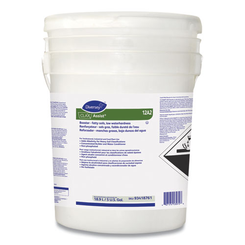 A liquid alkali builder/booster contains alkaline ingredients and special chelation ingredients for use in low-to-medium water hardness conditions in commercial and on-premise laundries. Improves soil removal; especially food (protein) and grease stains.