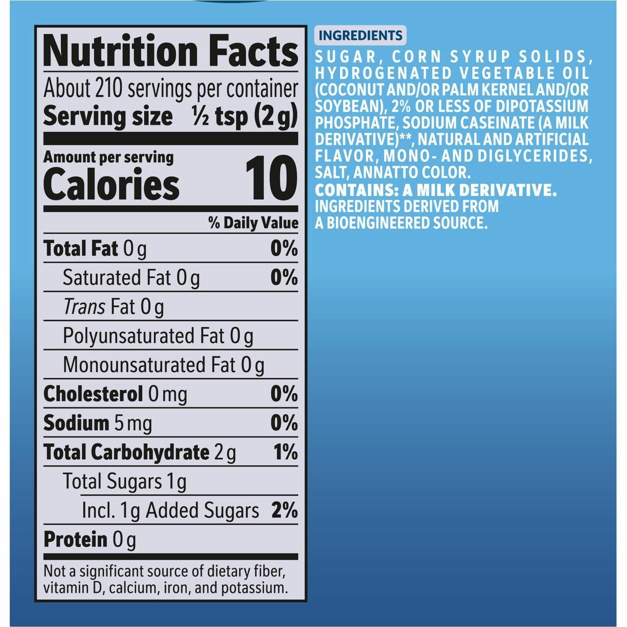 | Ingredients | <ul><li>Sugar</li><li>Vegetable Oil (Partially Hydrogenated Coconut Or Palm Kernel</li><li>Hydrogenated Soybean)</li><li>Corn Syrup Solids</li><li>And Less Than 2% Of Sodium Caseinate (A Milk Derivative)</li><li>Dipotassium Phosphate (Moderates Coffee Acidity)</li><li>Natural And Artificial Flavors</li><li>Mono- And Diglycerides (Prevents Oil Separation)</li><li>Sodium Aluminosilicate</li><li>Salt</li></ul> |