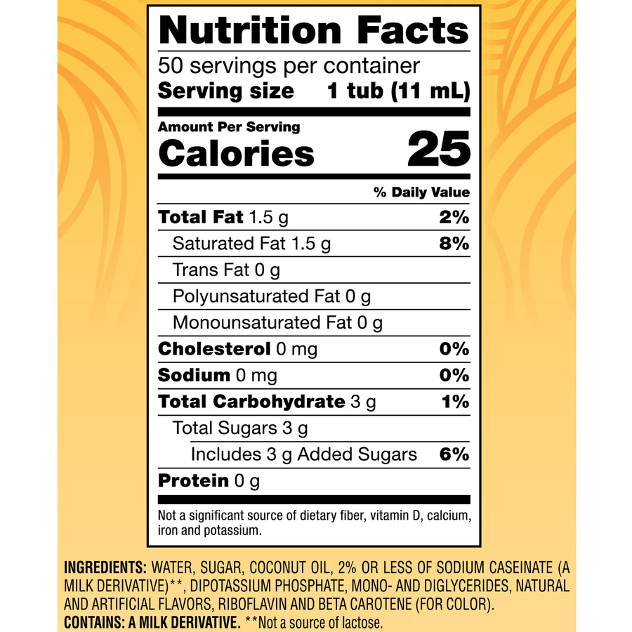 | Ingredients | <ul> <li>Water</li> <li>Sugar</li> <li>Partially Hydrogenated Soybean And/Or Cottonseed Oil</li> <li>And Less Than 2% Of Sodium Caseinate (A Milk Derivative)</li> <li>Mono- And Diglycerides</li> <li>Dipotassium Phosphate</li> <li>Color Added</li> <li>Cellulose Gel</li> <li>Natural And Artificial Flavors</li> <li>Cellulose Gum</li> <li>Carrageenan</li> <li>Dextrose</li> </ul> |