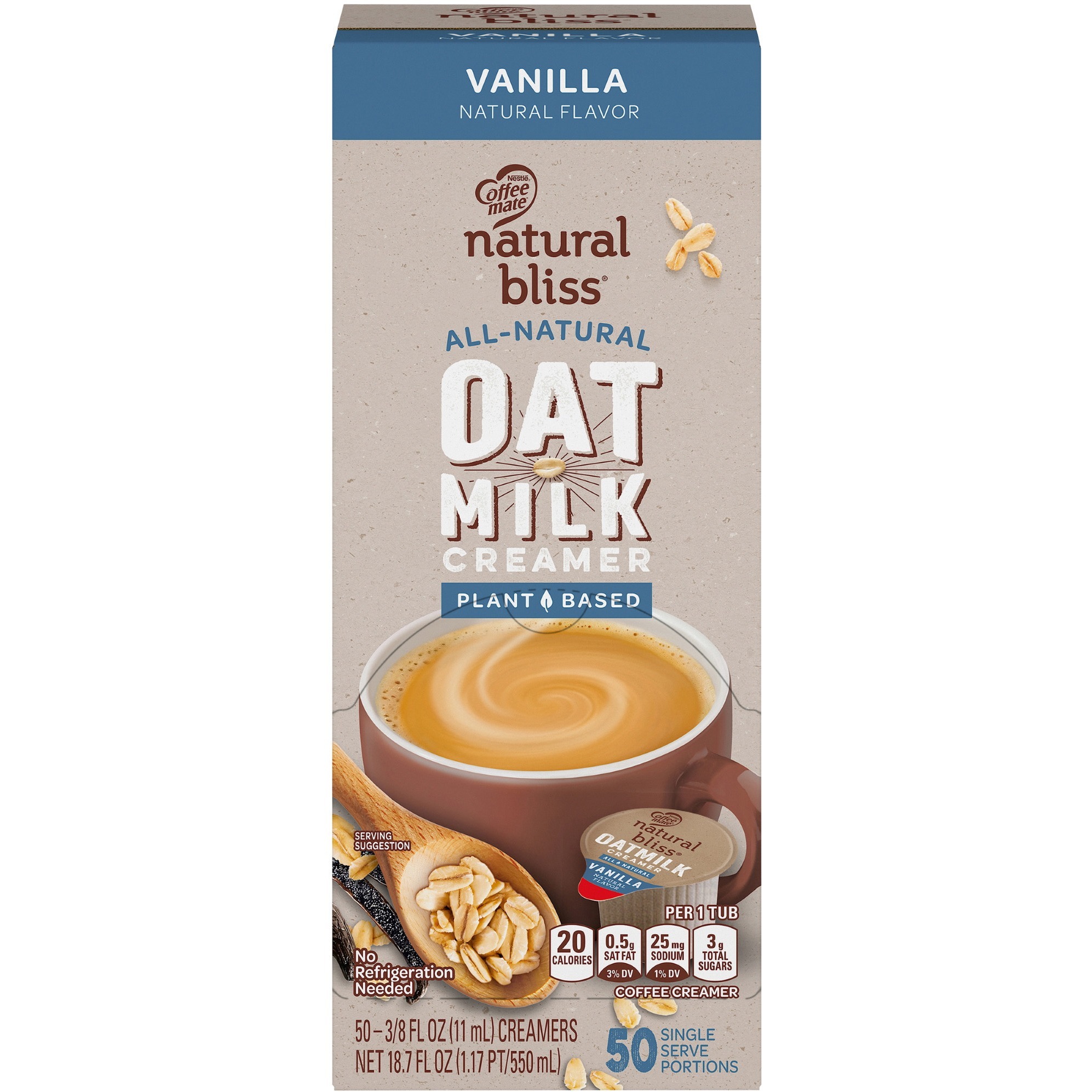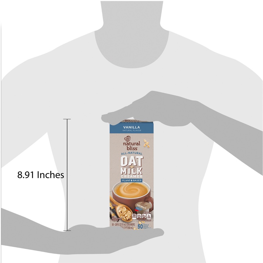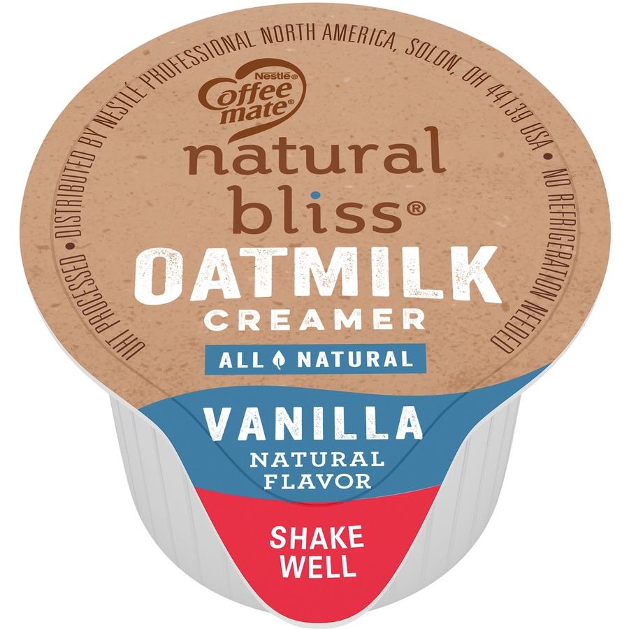 <p>Coffee mate Natural Bliss Oatmilk Creamer Singles are made with simple ingredients with all-natural vanilla taste. These 0.375 oz. tubs don't need to be refrigerated. They retain their flavor at room temperature for up to 9 months. Coffee Creamer Singles are easy to use. Simply shake, open and pour. Nondairy creamer (vegan) is lactose-free, cholesterol-free, gluten-free and Kosher Dairy. They come in a convenient dispenser box that keeps the counter clean and organized. Delight your employees, customers and guests by offering Coffee mate liquid creamer in your workplace, breakroom or kitchen.</p>