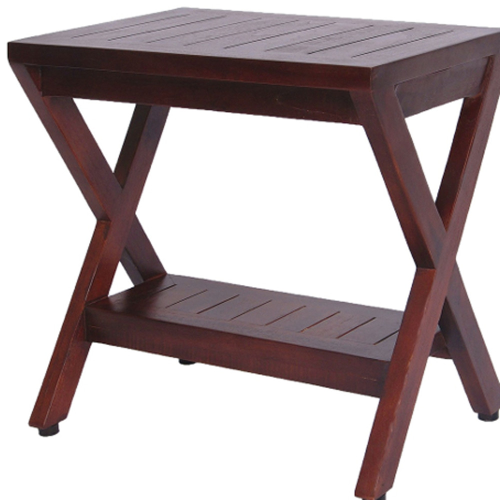 Compact X Shape Teak Shower Outdoor Bench With Shelf In Brown Finish