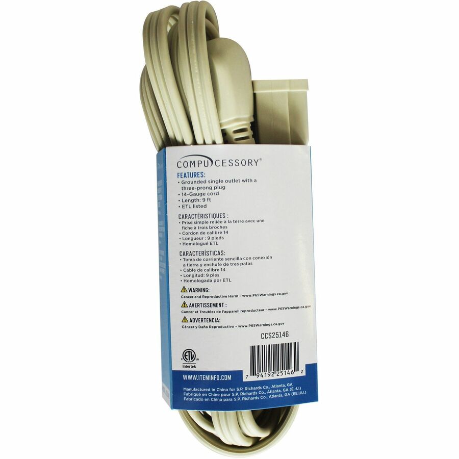Compucessory Heavy Duty Indoor Extension Cord – 14 Gauge – 125 V AC15 A – Beige – 9 ft Cord Length – 1