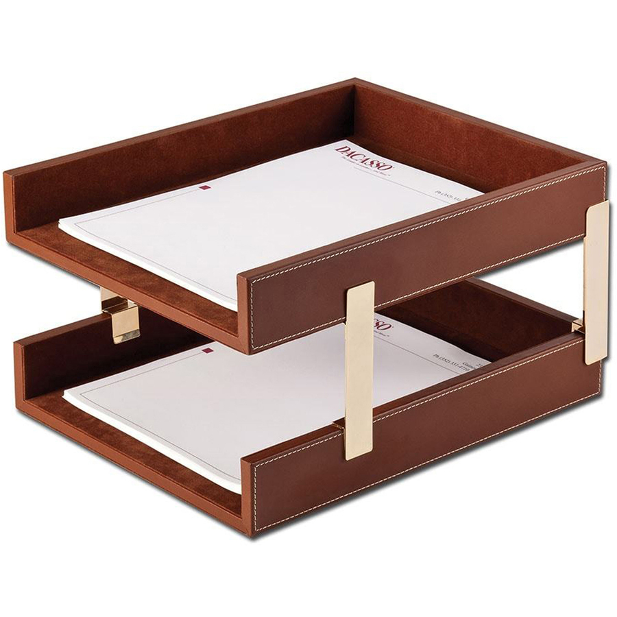 Dacasso Front Load Letter Tray With Gold Posts – 7.75″ x 10.6″ – Leather – Brown