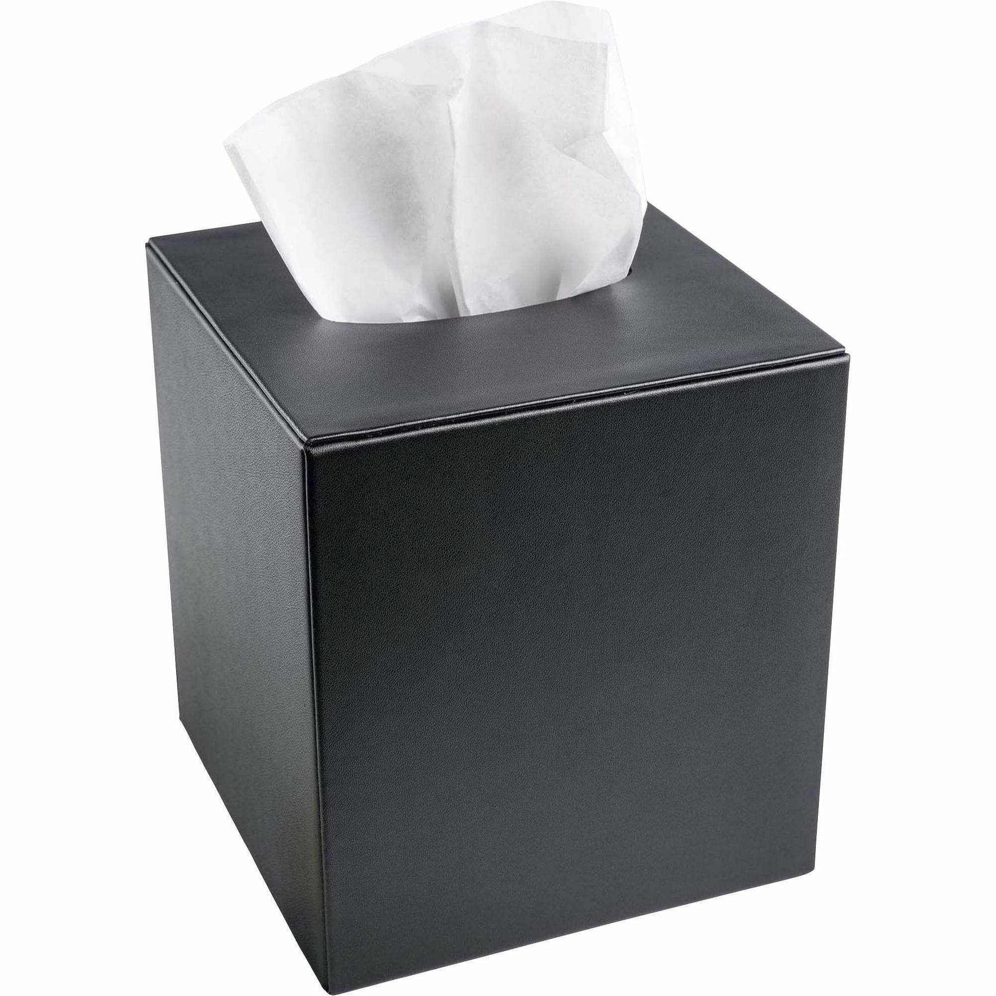 | Marketing Information | <p>Tissue Box Cover features an easy-to-use design that slides on and off of your tissue box to quickly replace depleted tissues. Faux-leather provides a classy appeal to any professional setting. Soft velveteen protects surfaces from scuffs and scratches. Tissue box cover is designed for cube-shaped tissue boxes (not included).</p> |
