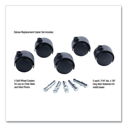 Contemporary design, strength and performance make these replacement casters an excellent choice for office and home furnishings. Each caster can be used with wood, metal and tubular metal chairs, various pieces of furniture and other equipment. All casters carry the manufacturer’s guarantee against defects in material and workmanship. To ensure proper support and safe rolling, neck must fit 1.5″ diameter chair base so that base and caster fit together as a solid unit. Choose soft wheel casters for use on chair mats and hard floors. Choose hard wheel casters for carpeting.Package Includes: (5) Type B 0.44″ x 0.88″ Stems