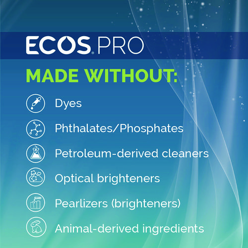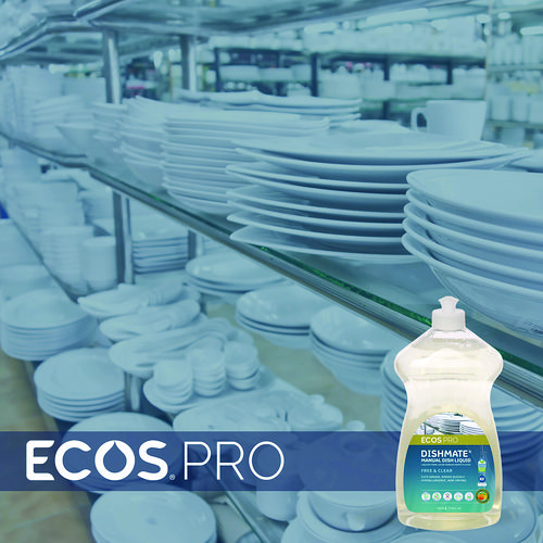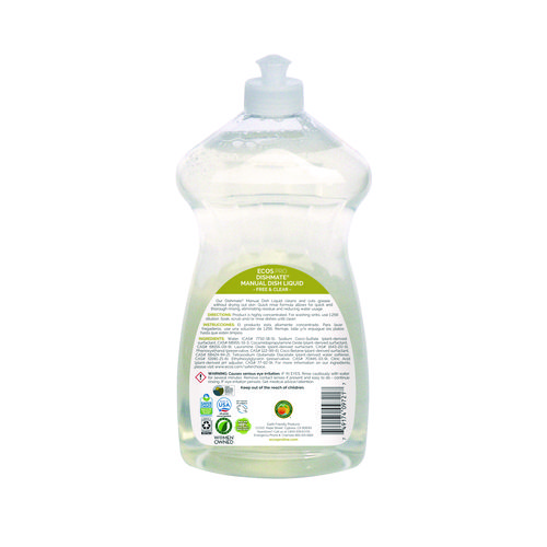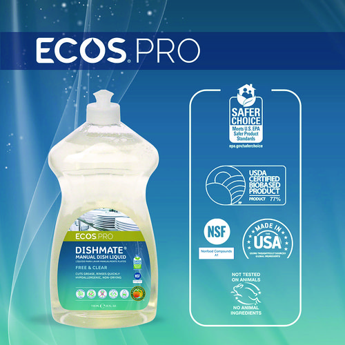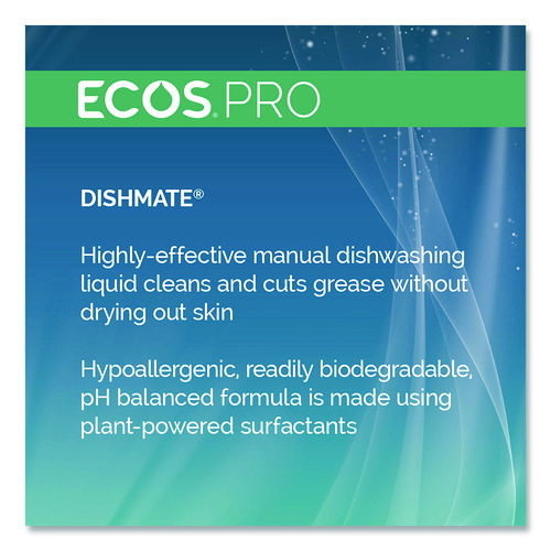 This highly effective ECOS PRO Dishmate manual dishwashing liquid cleans and cuts grease without drying out skin. The unique formulation leaves less residue on dishes for a quicker rinse time and reduction in water usage. The hypoallergenic, pH-balanced formula is made using sustainable, plant-derived surfactants. The product is free of dyes and is gray water and septic safe. Not tested on animals.