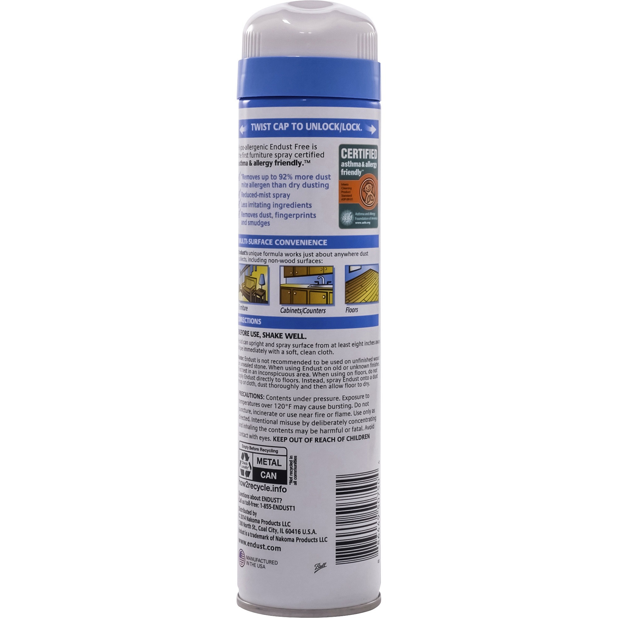 | Marketing Information | <p>Endust Free Hypoallergenic Dusting and Cleaning Spray features a hypoallergenic formula to remove at least 85 percent of allergens from hard surfaces with less irritating ingredients. It's also free of perfumes and fragrances to help prevent irritation from strong smells. Easy-to-use spray quickly and easily picks up dust and removes allergens, fingerprints and smudges from just about anywhere. Advanced solution removes up to 92 percent more dust mite allergens than dry dusting. Cleaner is certified asthma-friendly and allergy-friendly by the Asthma and Allergy Foundation of America.</p> |