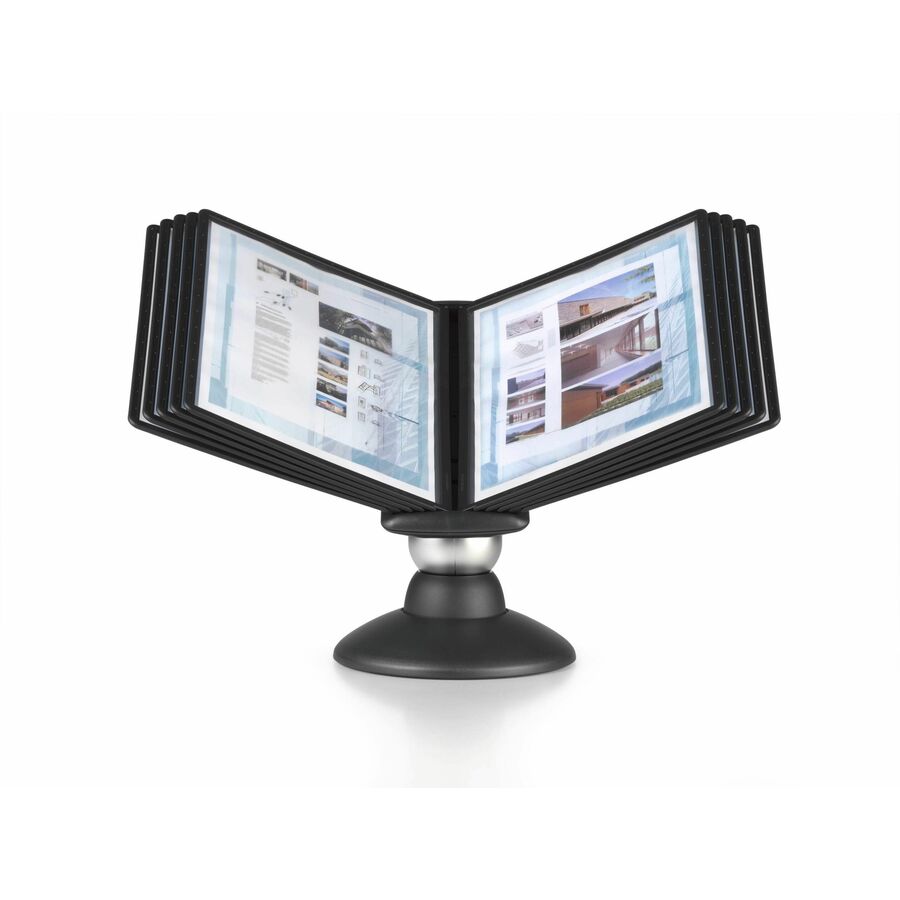 | Marketing Information | <p>Maximize productivity by placing important information at your fingertips with a desktop organizer. Desktop reference system can be placed on any desk, workstation or countertop to put frequently referenced documents and information at your fingertips. Set contains metal desk stand, two mounting plates, index tabs, pluggers, hardware and 20 color-coded, wire-reinforced pockets. Each pivoting pocket has two viewing sides for a total capacity of 40 letter-size sheets or viewing sides. PVC pockets are designed for optimum visibility and provide optimal protection for your documents against dirt, spills and dust, even with intensive use. Rack is expandable up to 30 pockets (additional pockets sold separately).</p> |