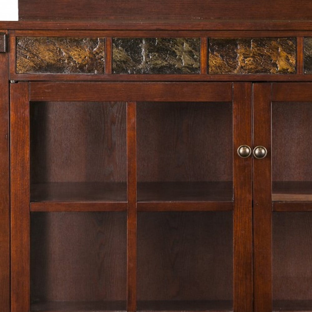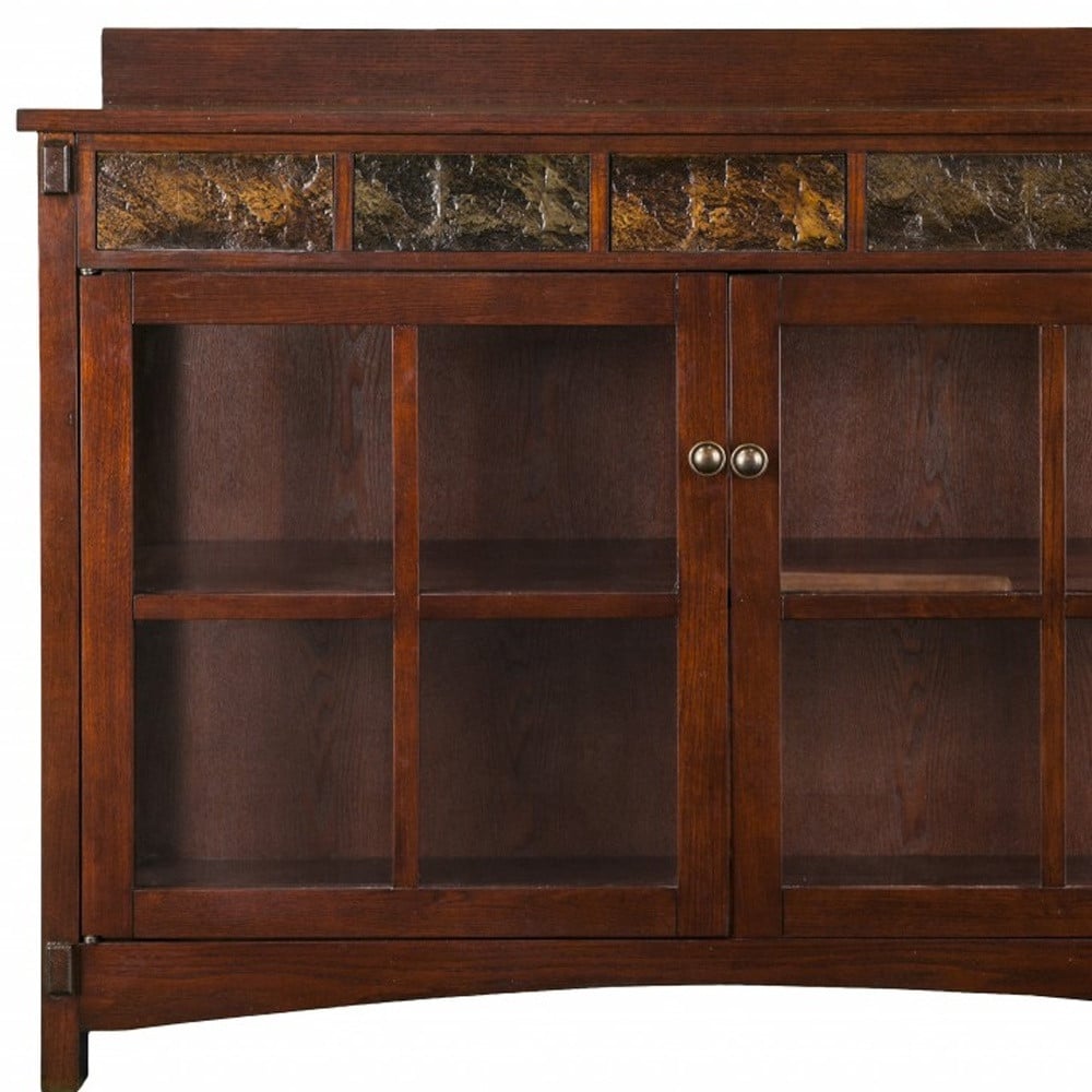 Multifunction rules the roost with this truly versatile Earthy Mission Style Wood Slate and Glass Low Curio. This storage credenza in a warm mahogany redish brown finish comes complete double glass windowpane doors and row of faux slate bricks across the front. The glass on the doors and sides offer peek-a-boo storage of all your faborite essentials and treasures. The unique rustic take on the mission style will look at home in your living room, office, entrance hallway and potentially even kitchen. 34.5″ x 44″ x 15″