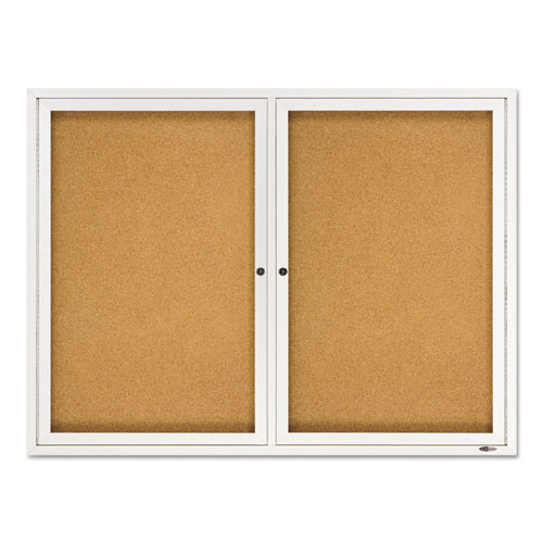 Enclosed Indoor Cork Bulletin Board with Two Hinged Doors, 48″ x 36″, Tan Surface, Satin Aluminum Frame