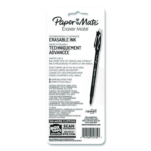 Write comfortably from any angle and easily revise your mistakes with the Paper Mate EraserMate Pen. The advanced ink of this erasable pen becomes permanent after 24 hours on paper, giving you plenty of time to correct mistakes. With the Paper Mate EraserMate Pen, you can enjoy the smooth marks of a pen with the erasability of a pencil.