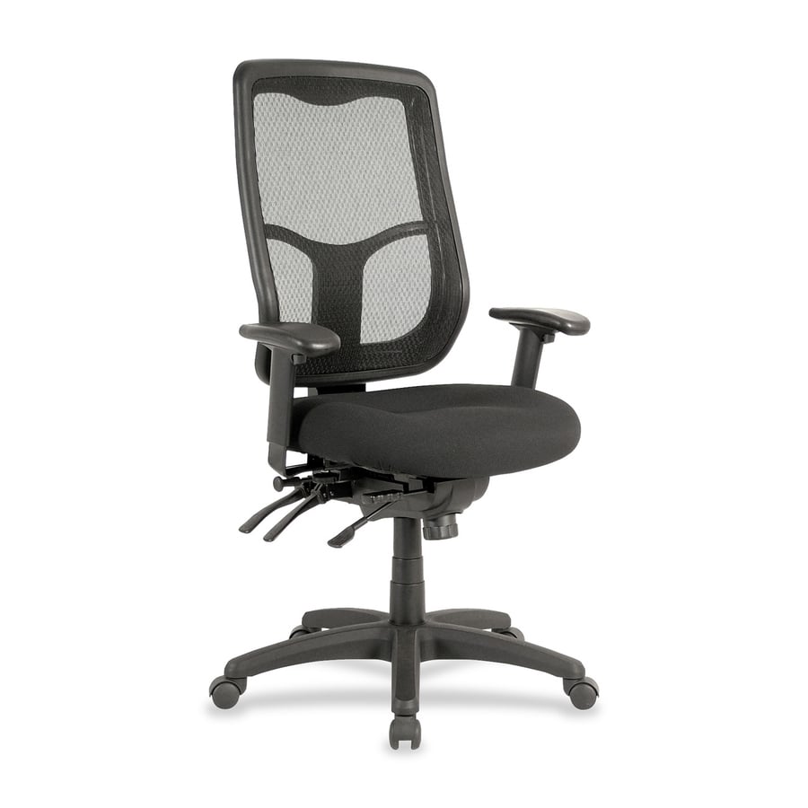 Apollo High Back Multifunction Chair features a ratchet back that moves up or down relative to the seat for lumbar support and comfort. Set seat back at an angle for personalized comfort in reclined position. Seat-height adjustment lets you position the seat height relative to the floor. Adjust tension to rock back and forth. Seat depth slides relative to back for ultimate, customized seating. Fabric-upholstered, padded, waterfall seat with sloping front reduces pressure on the back of the knees. Tilt-tension control with tilt lock allows you to adjust the recline rate based on your weight. Tilt seat forward to change the seat angle for a comfortable position when you're using a keyboard. Depth-adjustable arms slide forward or backward for proper ergonomic positioning. Arm-height adjustment adjusts arm up or down while arm pads angle in or out. Nylon, five-star base features casters for easy mobility. Chair is Greenguard certified to have low chemical emissions.