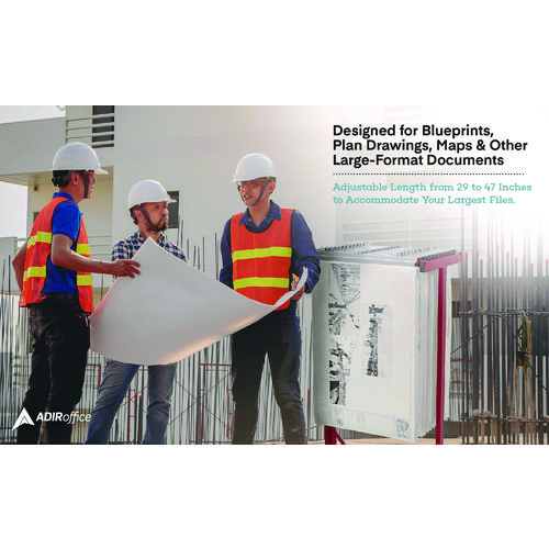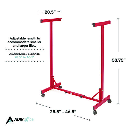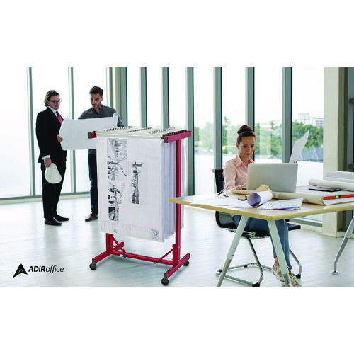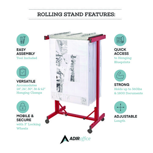 Stay organized and efficient in the office with the AdirOffice Expandable Mobile Plan Center for Blueprints. For quick access, hanging blueprint storage, just clamp your files into hanging paper clamps and drop them into the top bracket. Designed for blueprints, plan drawings, maps and other large-format documents. Made of heavy-gauge steel with a 360 lb weight capacity, this rack can hold up to 1,800 documents at once. With its durable construction and powder-coated finish, you can be certain that it will provide long-lasting strength and use for years to come. For added convenience, this blueprint rack is adjustable to accommodate your largest files. The bracket accommodates 18 clamps and can be adjusted to fit paper clamps that are 24″, 30″, 36″ or 42″. Only one size of hanging clamps can be placed into this mobile blueprint stand at any one time. An ingenious solution to the difficulties of moving documents, this mobile plan center works equally well in harsh environments, such as construction sites, and soft settings, such as modern offices. Four swivel casters, two of which brake for control of movement and to keep the rack stable when you get to your destination, let you move this much weight with ease.Note: This is a non-returnable item.