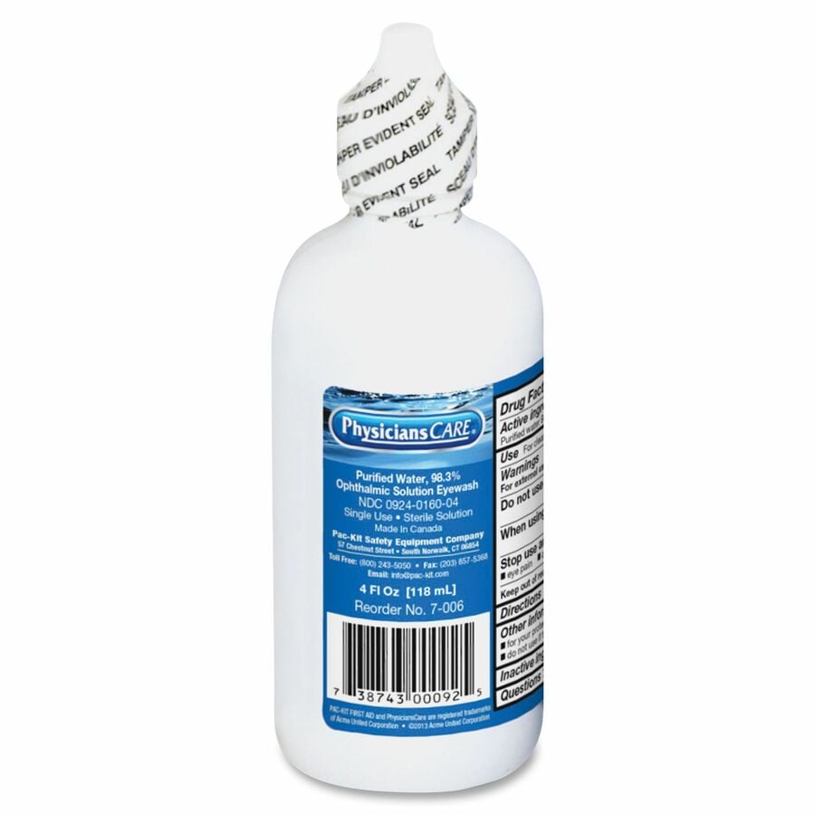 <p>Single-user eyewash relieves irritation by removing loose foreign material, chlorinated water, smog and pollen. It contains purified water and 98.3 percent ophthalmic solution. Bottle has an easy-to-open screwtop.</p>