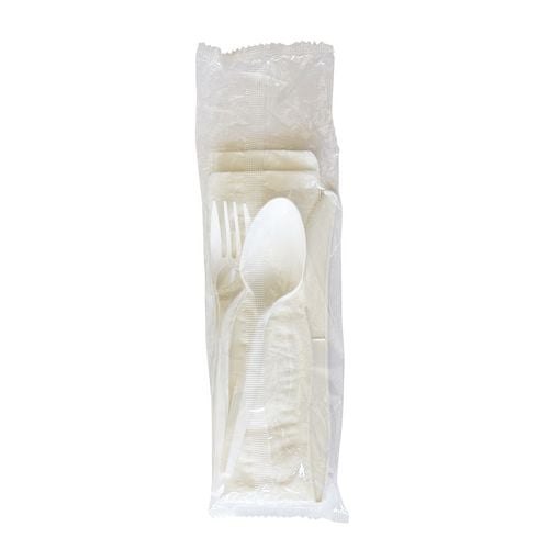 Four-Piece Polypropylene Cutlery Kit, Mediumweight, Fork/Knife/Napkin/Spoon, Plastic, White, 250/Carton