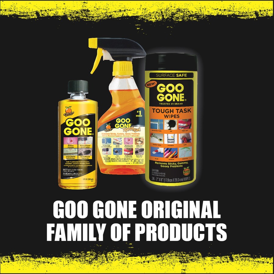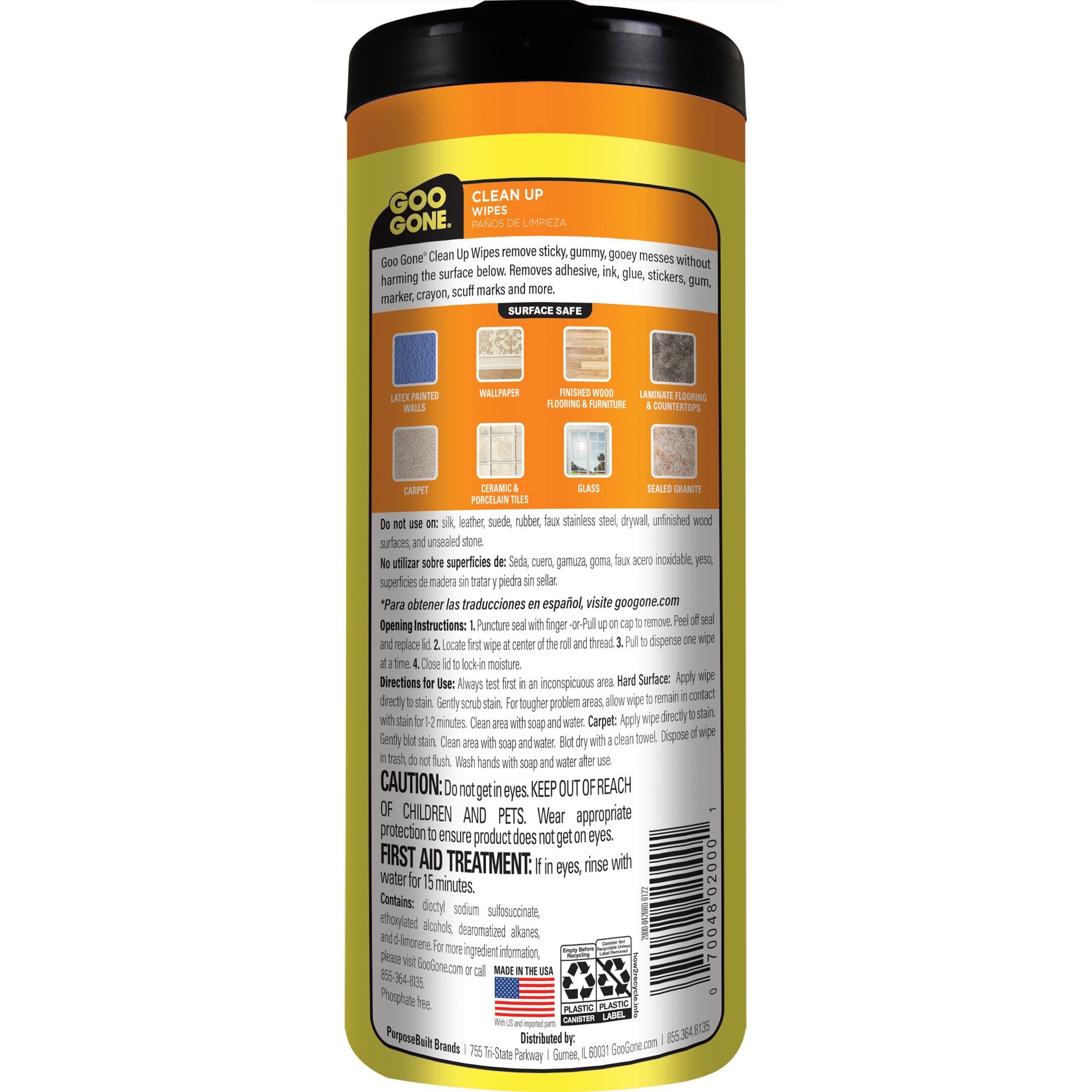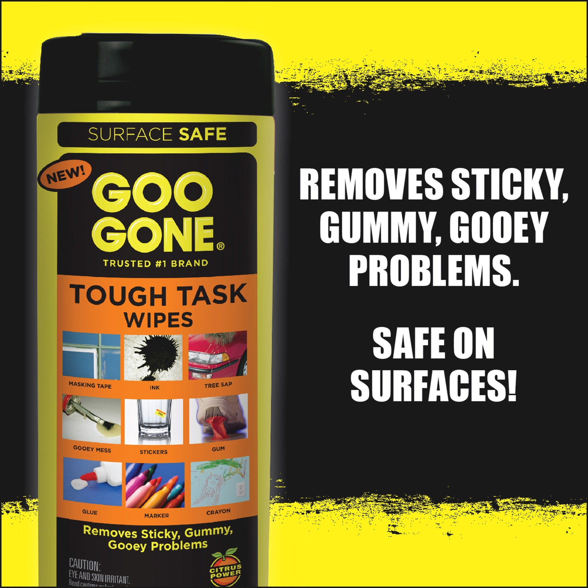 | Marketing Information | <p>Harness the power of Goo Gone in this convenient wipe. Eliminate your sticky, gooey, gummy problems without harming your surface. The gentle, nonabrasive formula is safe for daily use. The wipes are great for quick cleanups and easy to take on-the-go in its canister. Wipes are disposable. Goo Gone Tough Task Wipes are recommended for cleaning scuff marks, masking tape residue, ink spills, paint tree sap, stickers, gum, glue, markers and crayon. It is safe for use on latex painted walls, wallpaper, wood flooring and furniture, laminate flooring and countertops, carpet, ceramic tiles, glass, stainless steel and granite.</p> |