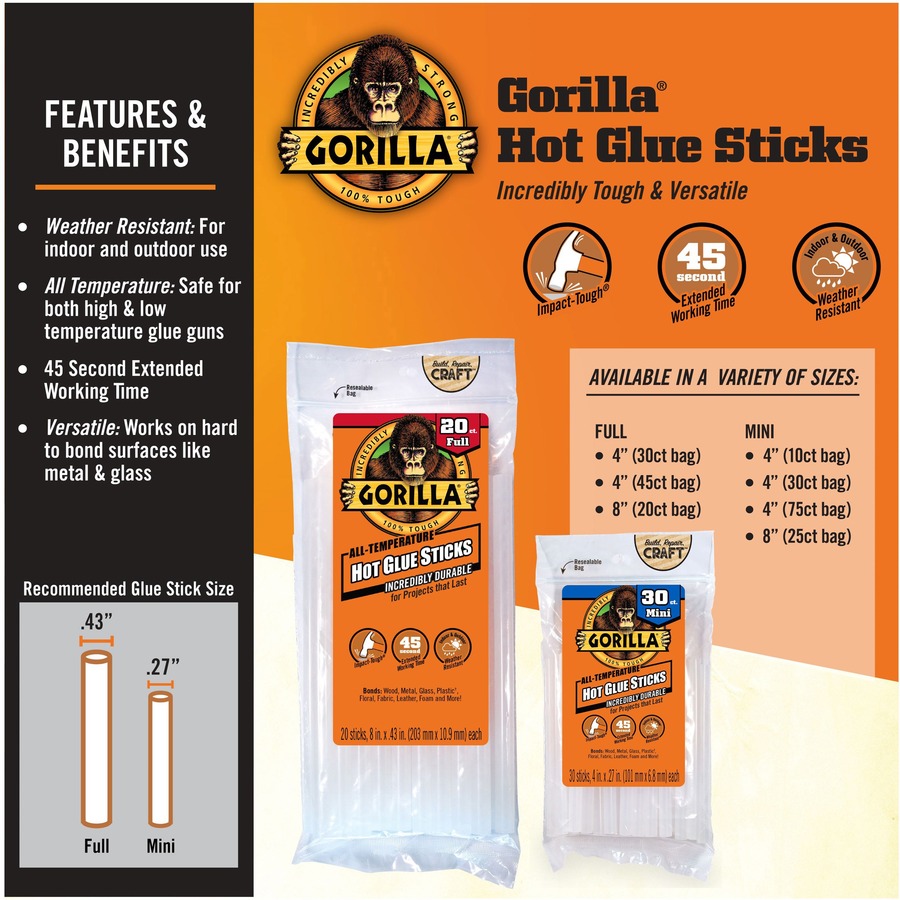 | Marketing Information | Incredibly tough and versatile, these Mini Hot Glue Sticks provide a long-term hold even on hard-to-bond surfaces. Clear adhesive works with both high and low temperature glue guns and features an extended working time of 45 seconds for added convenience for all types of projects. Gorilla Hot Glue is also weather-resistant so you can use indoors and outdoors. It is incredibly durable, keeping projects safe from seasonal temperature swings that can cause other glues to fail. <p><a id="gfk-spex-minisite" rel="nofollow" href="javascript:void(0)" onclick="javascript:window.open('//content.etilize.com/mini-site/en_us/1076039444.html', '_blank', 'height=800, width=780, resizable=yes, scrollbars=yes, toolbar=no, menubar=no, location=no, directories=no, status=no'), return false, ">More from the Manufacturer</a></p> |