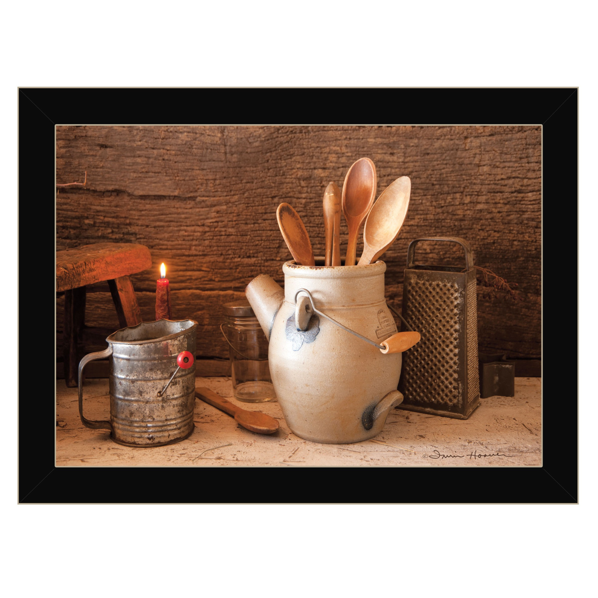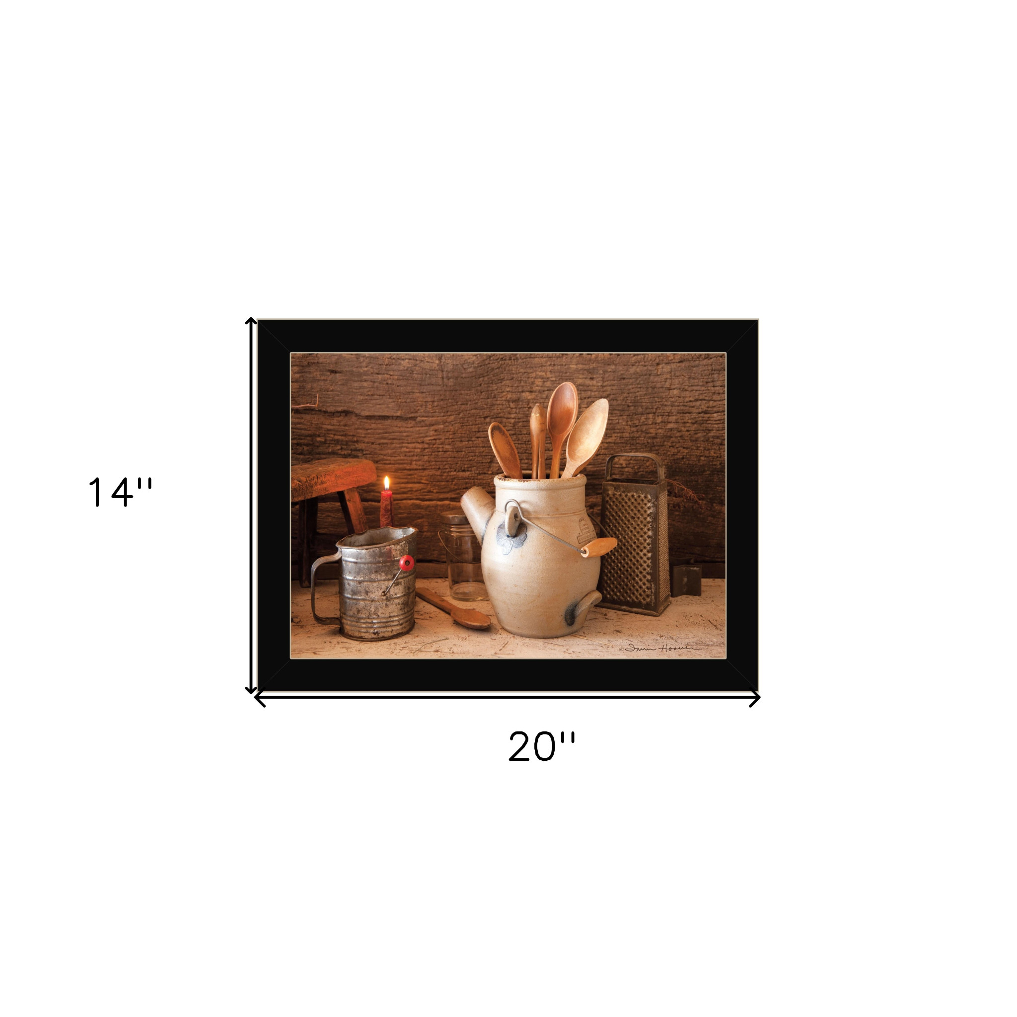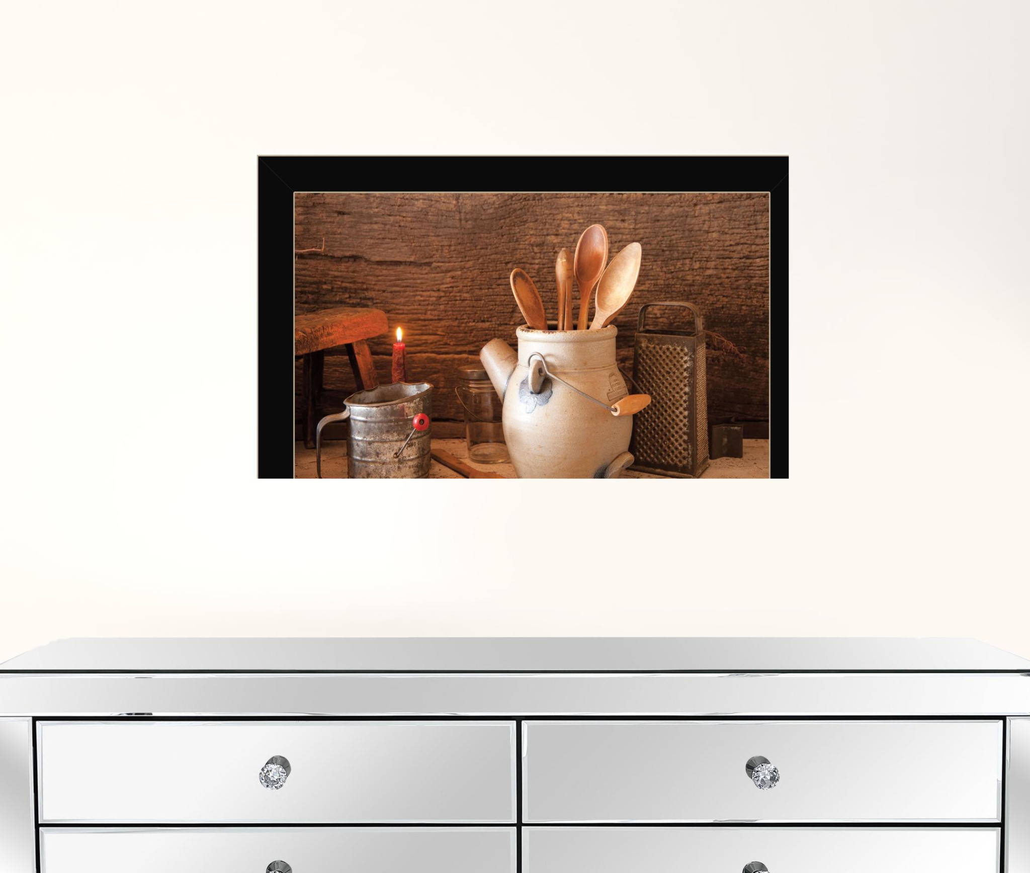 Add an air of fashion to your room and rejuvenate the space with this grandmas kitchen tools 1 black framed print kitchen wall art. This print is a visual artistic expression that allows you to decorate your space in style. Reproduced for you on paper, this hanging decorative accent will be a trendy and fashionable way to dress your walls. Hang on your wall to add some up to date fashion and decoration. Utilize this opportunity to create a focal point in the room with this fabulous wall decor option. 14 inches H x 20 inches W x 1 inches D