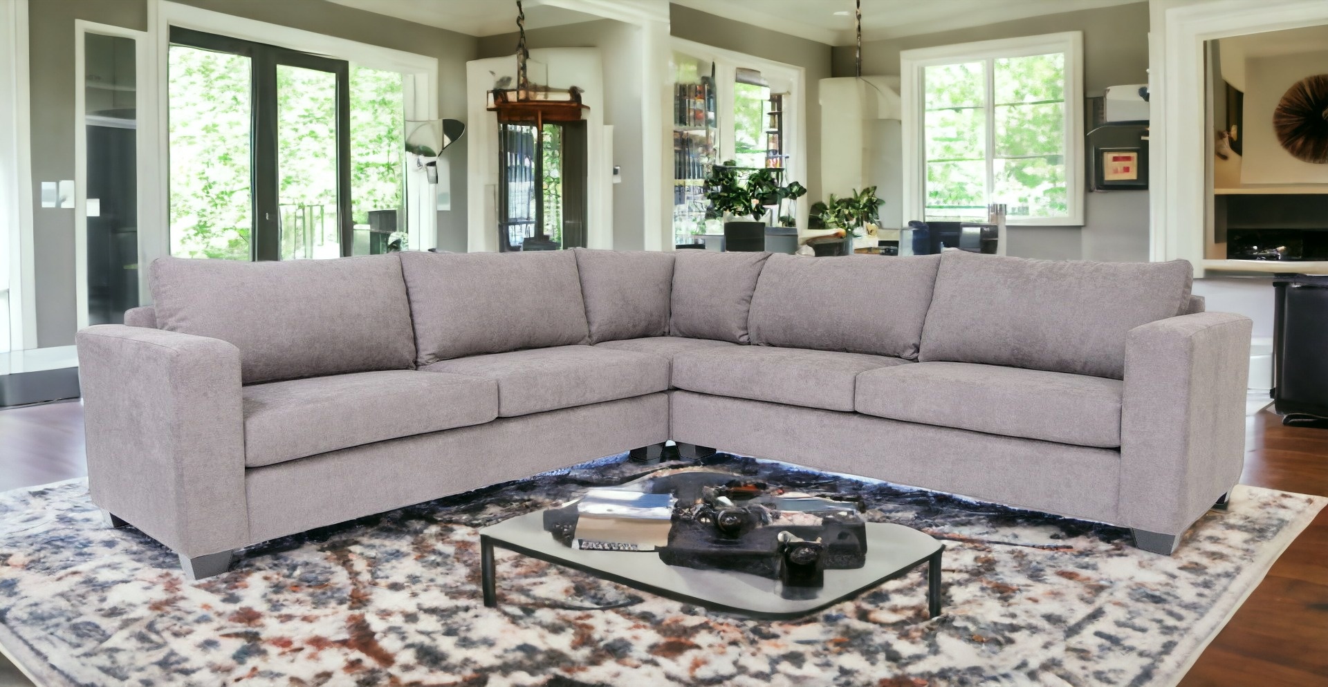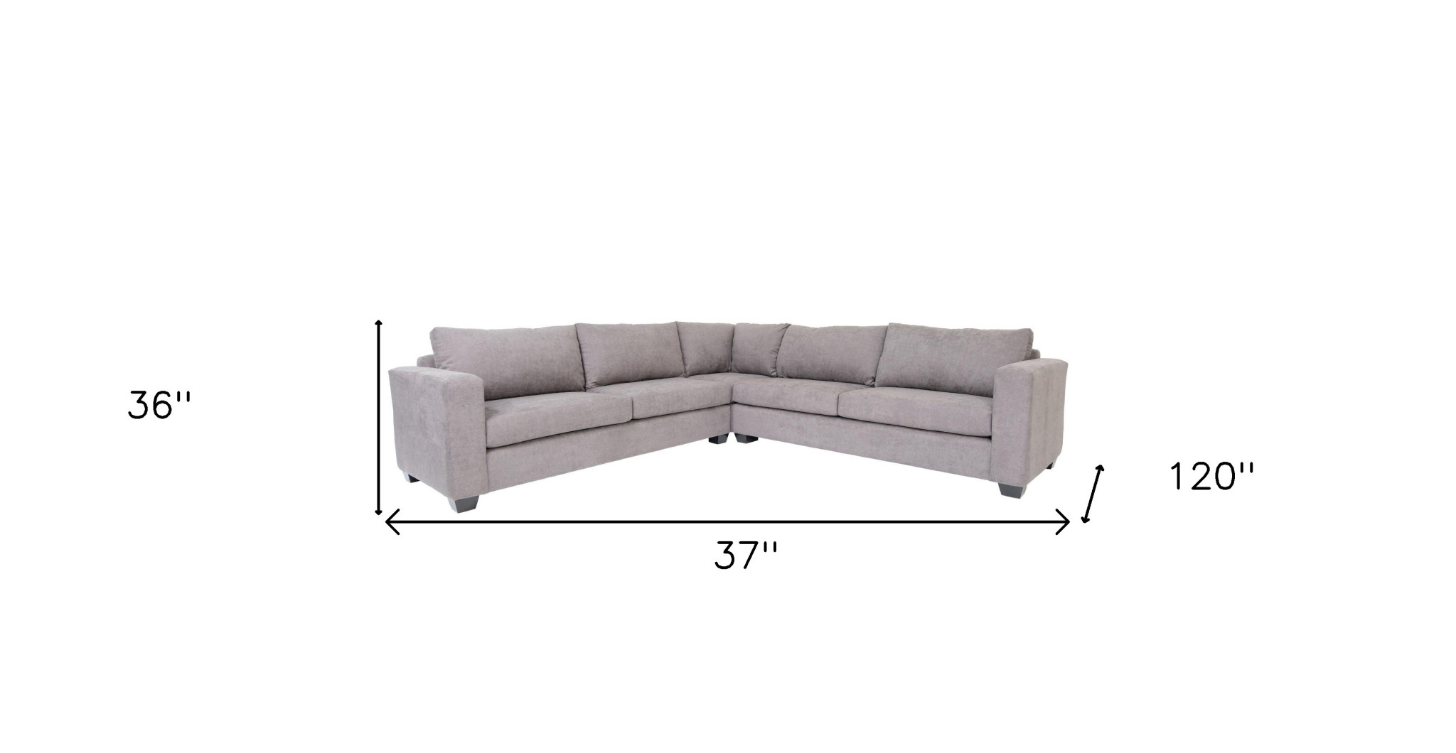 Add an air of fashion to your space with this fabulous gray polyester blend L shaped three piece corner sectional. Square arms offer a comfy place to rest. Dark brown solid wood legs effortlessly elevate the room and add a touch of contemporary design. Great for everyday lounging and for entertaining, sectionals are an ideal way to seat multiple people. 36-inch H x 120-inch W x 37-inch D