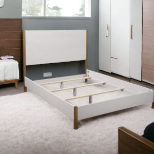The gray solid wood queen bed frame is the ultimate combination of comfort and style. Quality craftsmanship in every facet of production ensures durability and long-lasting wear. This bed is the perfect way to make your bedroom comfortable and inviting. Inspired by mid-century design elements, this bed will add a clean and fashionably look to your space. 52-inch h x 86-inch w x 65-inch d.