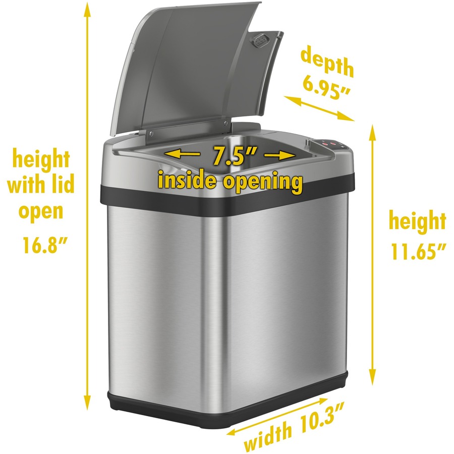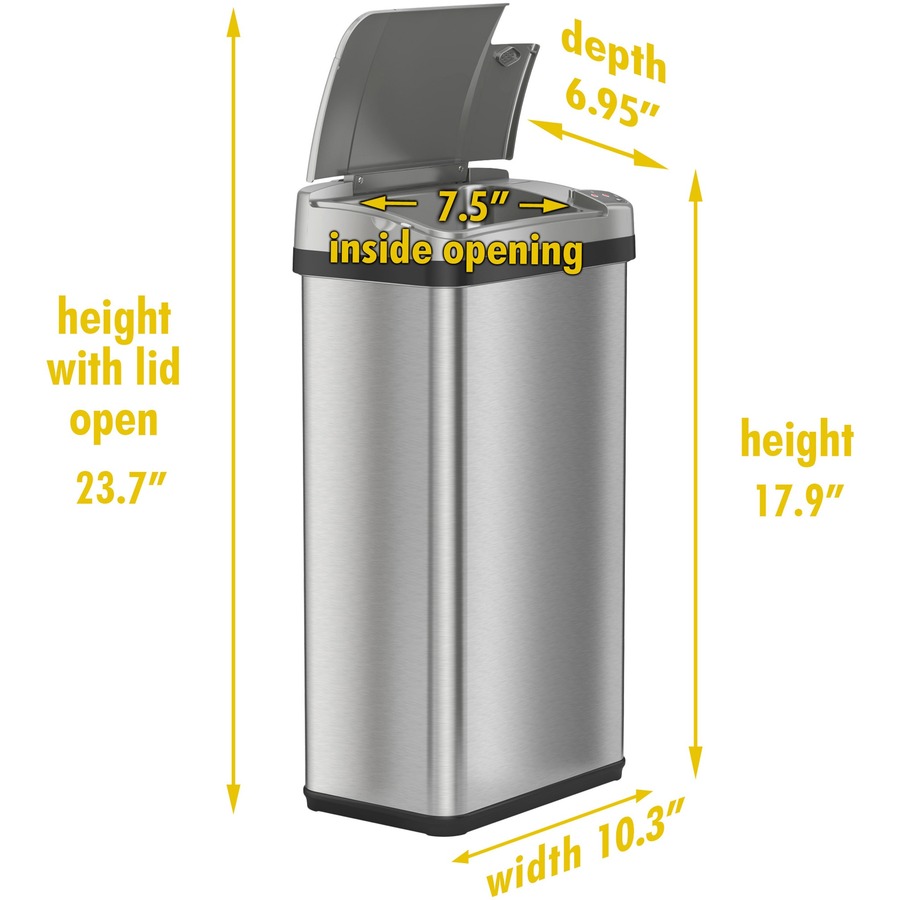 | Marketing Information | <p>2.5-Gallon Sensor Trash Can features a corner-mounted sensor for completely touch-free operation. The included fragrance cartridge works with the activated carbon filter to stop odors and fill the surrounding area with the crisp, clean scent of fresh-cut lemons. High-quality, ABS plastic lid combined with a stainless steel body works to repel dust, dirt and fingerprints. Removable bag retainer ring keeps trash bags in place and out of sight. Trash can provides up to 6 months of operation using four AA batteries (not included), or it can operate continuously with the optional AC adapter (not included).</p> |