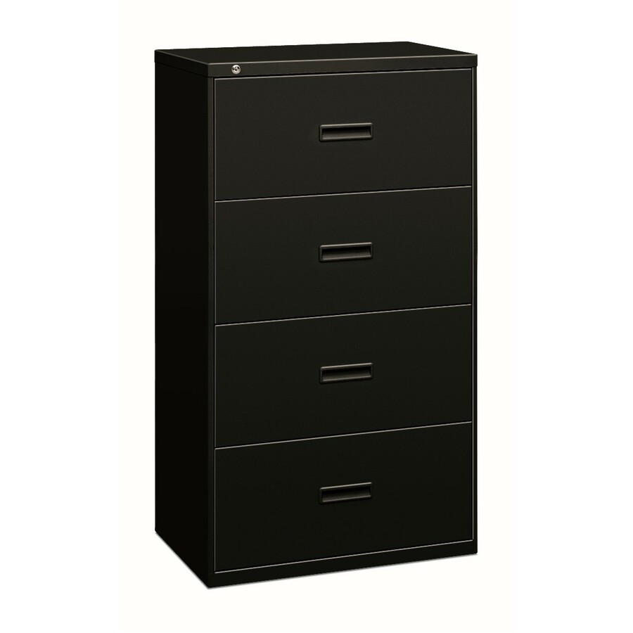 | Marketing Information | <p>36" wide, four-drawer lateral file efficiently maximizes floor space and is designed for light-duty use. Each drawer accommodates letter-size or legal-size filing from side-to-side with included hangrails. Front-to-back filing is possible with other accessory hangrails (not included). Drawers lock and feature ball-bearing slide suspension for smooth movement. Mechanical interlock allows only one drawer to open at a time. Steel, reinforced case construction features baked enamel finish for durability. Two adjustable leveling glides in front corners stabilize the lateral file on uneven surfaces. Black lateral file is certified by SCS to be in compliance with specific, indoor, air-quality emission requirements and meets or exceeds applicable ANSI/BIFMA standards.</p> |