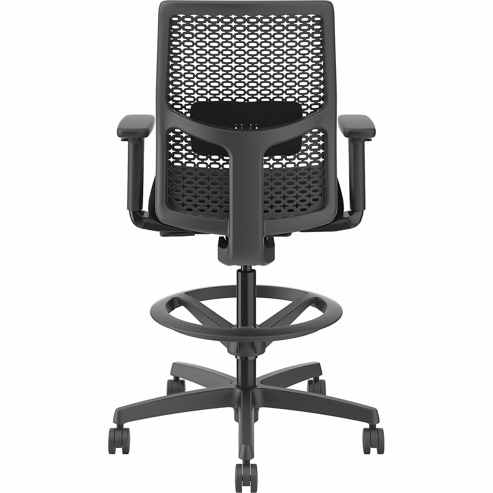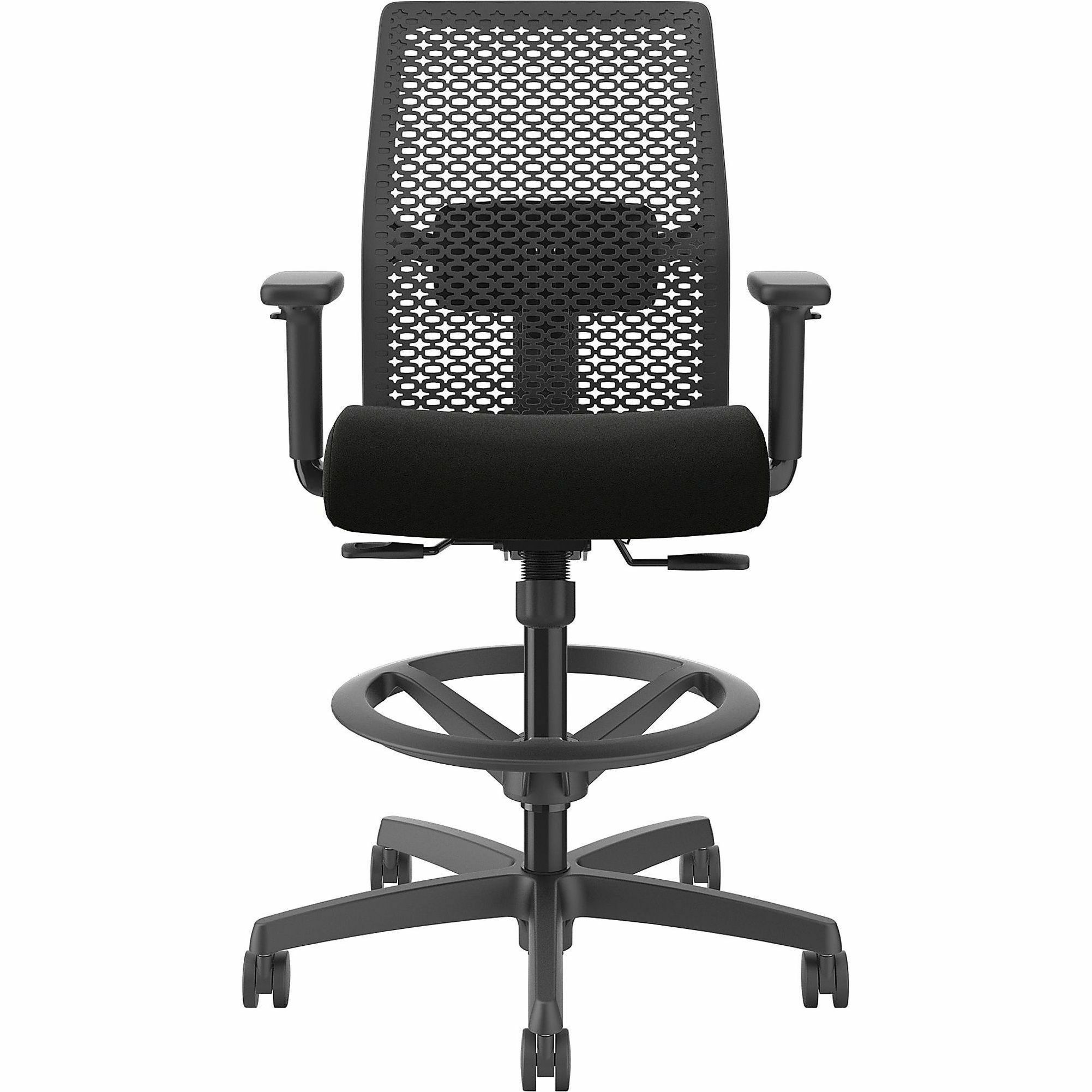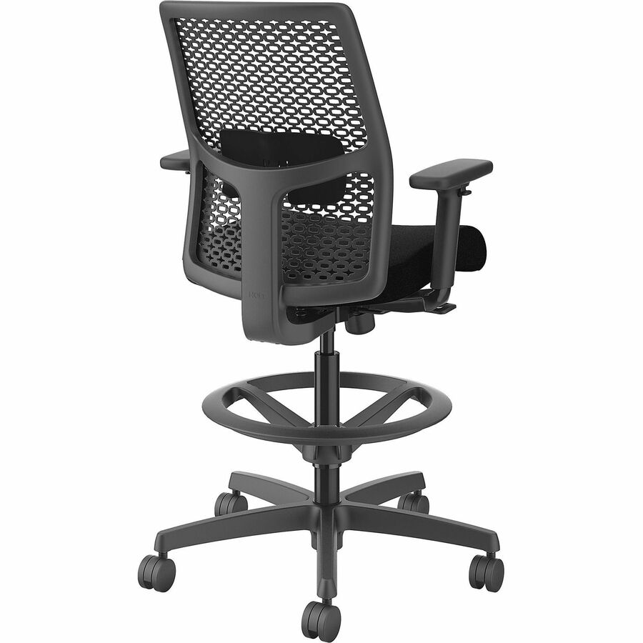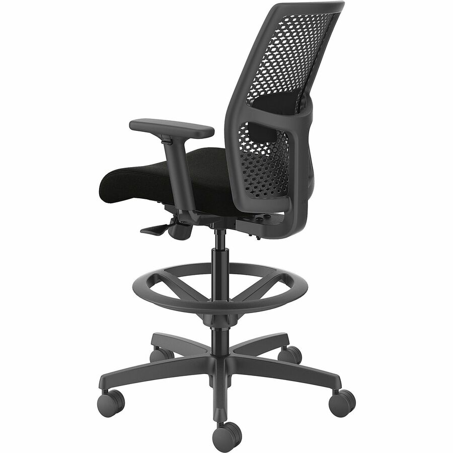 | Marketing Information | Ignition ReActiv Low-Back Task Stool gives you control over your domain with the ability to either sit or stand at an adjustable-height workstation or bring people around standing-height collaborative tables. Charcoal ReActiv back features zonal comfort that delivers optimal support and flexibility. Molded foam seat provides better support and added comfort. Arms adjust in height and width to enhance your comfort. Other comfort functions include pneumatic adjustable height from 22-7/8" to 31-3/4", 360-degree swivel, limited recline synchro-tilt with seat slider, tilt tension and tilt lock. Sturdy, five-star nylon base glides on black hard casters for convenient mobility. Chair accommodates users up to 300 lb. Frame is black. Fabric seat upholstery is Black Contourett. Seat measures 18-1/2" wide x 16" deep. Back size is 17-1/2" wide x 19" high. |