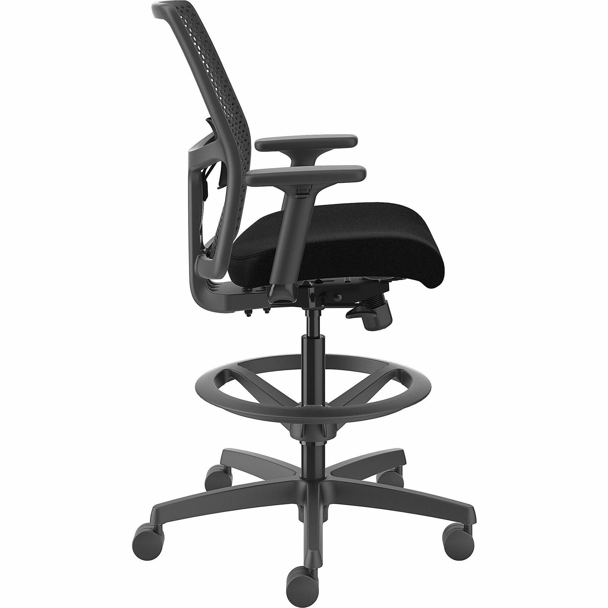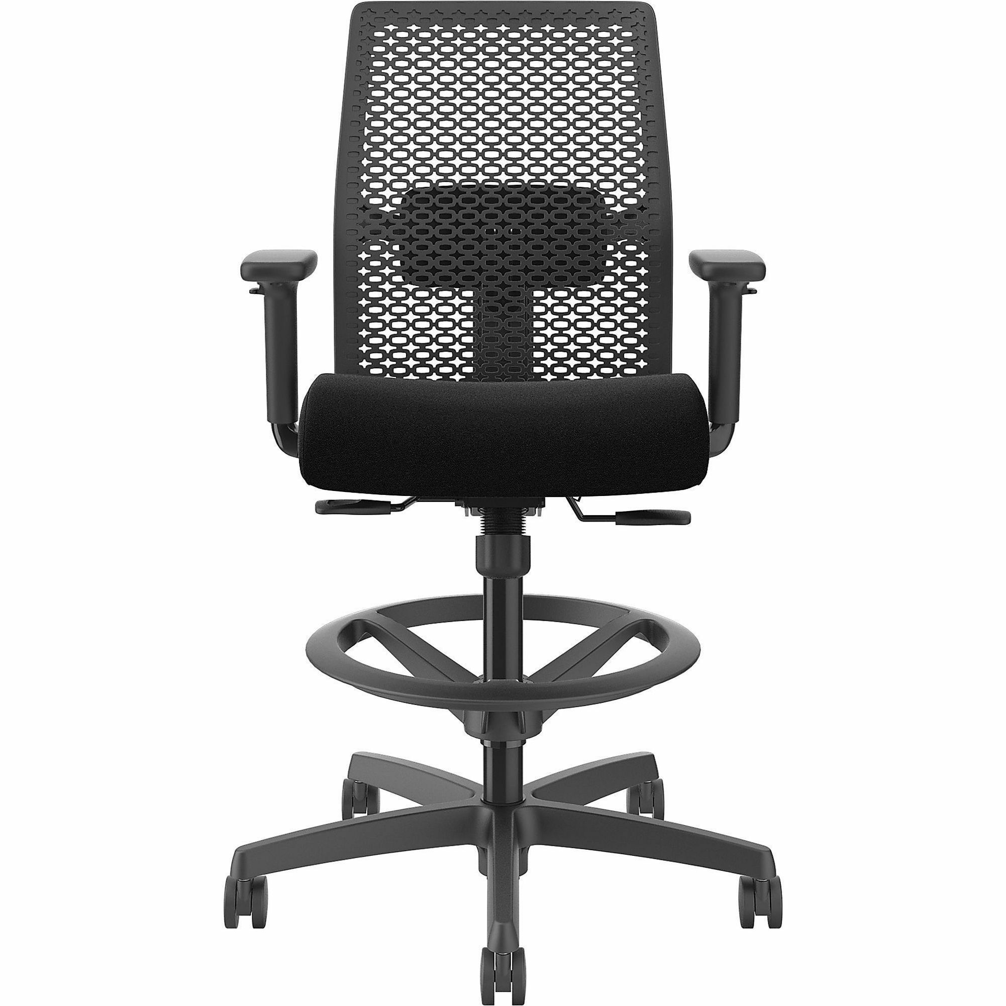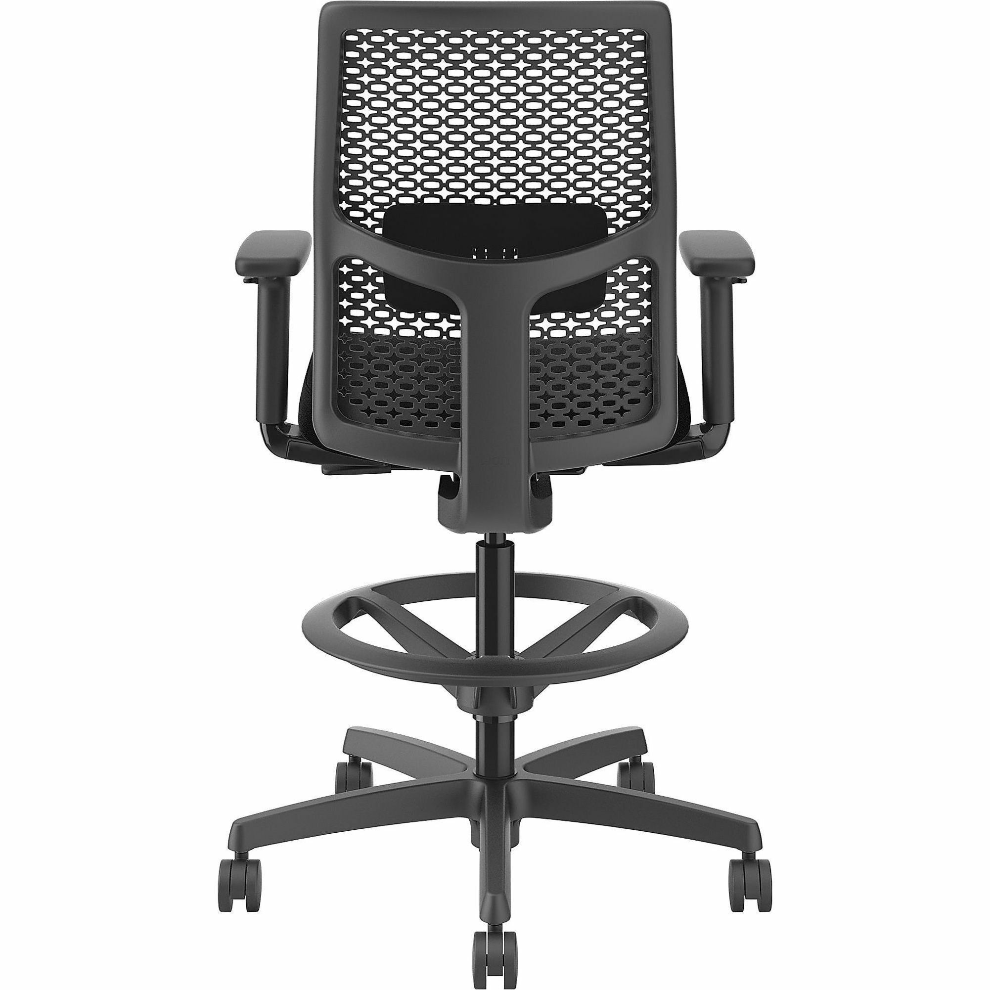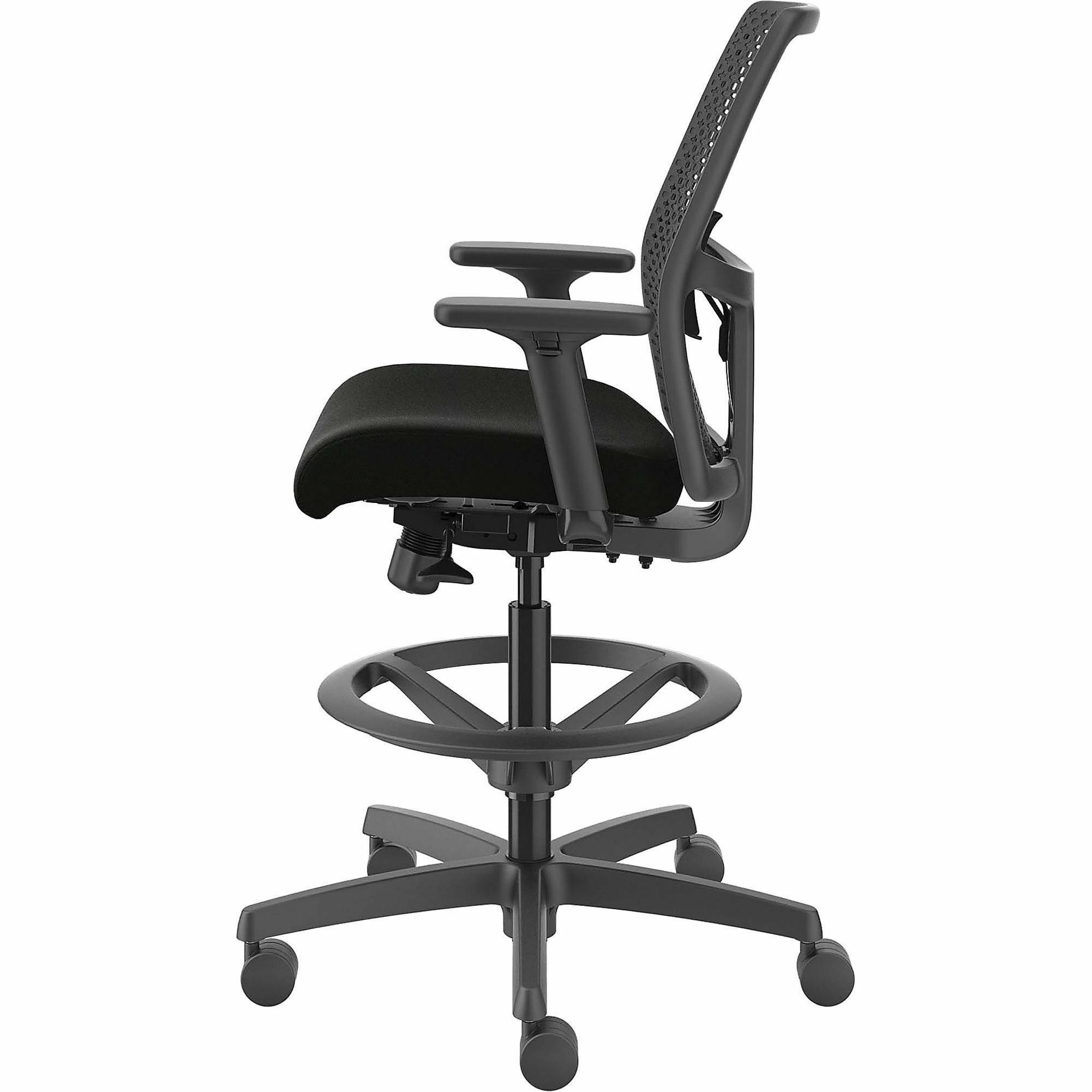 | Marketing Information | Ignition ReActiv Low-Back Task Stool gives you control over your domain with the ability to either sit or stand at an adjustable-height workstation or bring people around standing-height collaborative tables. Charcoal ReActiv back features zonal comfort that delivers optimal support and flexibility. Molded foam seat provides better support and added comfort. Arms adjust in height and width to enhance your comfort. Other comfort functions include pneumatic adjustable height from 22-7/8" to 31-3/4", 360-degree swivel, limited recline synchro-tilt with seat slider, tilt tension and tilt lock. Sturdy, five-star nylon base glides on black hard casters for convenient mobility. Chair accommodates users up to 300 lb. Frame is black. Fabric seat upholstery is Black Contourett. Seat measures 18-1/2" wide x 16" deep. Back size is 17-1/2" wide x 19" high. |