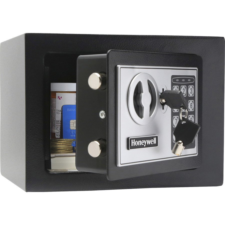 Honeywell 5005 Small Digital Steel Security Safe (0.17 cu. ft .) – 0.17 ft� – Programmable, Digital, Combination, Key Lock – 2 Live-locking Bolt(s) – Scratch Resistant, Pry Resistant – for Passport, Wallet, Cash – Internal Size 6.70″ x 9″ x 6.90″ – Overall Size 6.5″ x 8.9″ x 5.1″ – Black – Steel, Steel, Steel, Steel
