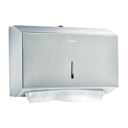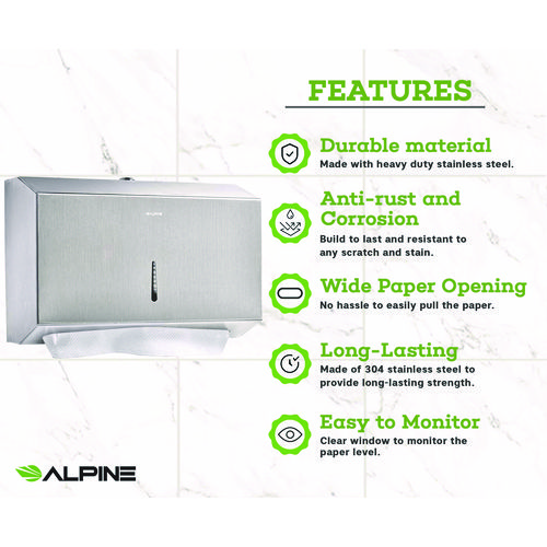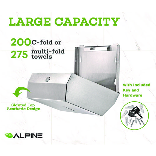 The Alpine Industries C-Fold/Multi-Fold paper towel dispenser is ideal for high traffic restrooms, break rooms, food service facilities, health-care facilities and more. Made of durable stainless steel with a brushed finish and features a lock to help prevent tampering and vandalism. The dispenser features a sight window on the front to monitor fill levels. The paper towel dispenser can easily be mounted to any wall or surface. A slanted top adds style, while preventing it from being used as a shelf and ensuring long-term use.Note: This is a non-returnable item.