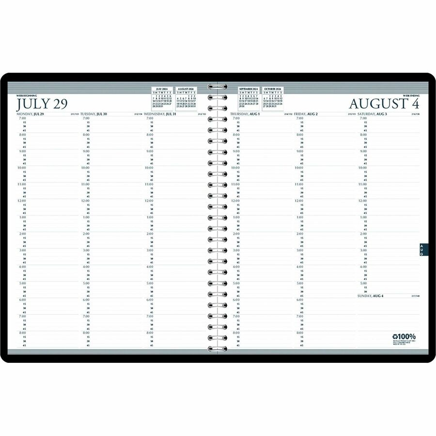 | Marketing Information | <p>Schedule quarter-hourly appointments six days a week with this vertical-style weekly planner. Dated planning pages range 12 months from August to July for easy planning and quarter-hourly appointments. Weekday times range from 7 AM to 8:45 PM. Saturday times range from 7 AM to 5:30 PM. Sunday is open for flexible organizing. Two-page-per-week spreads include ruled daily columns, Monday-through-Sunday scheduling, count of days/days remaining, a ruled notes section, and four months reference. Printed monthly indicators quickly find the date you need. Strong wire binding firmly keeps the planner intact throughout the year. Three-year calendar reference page allows long-range planning. Additional page with important holiday dates display three years in list form. Nonrefillable planner also features embossed, simulated leather cover for a professional look and FSC certified paper made with a high percentage of recycled material. Wire binding and cover is also made of recycled material.</p> |