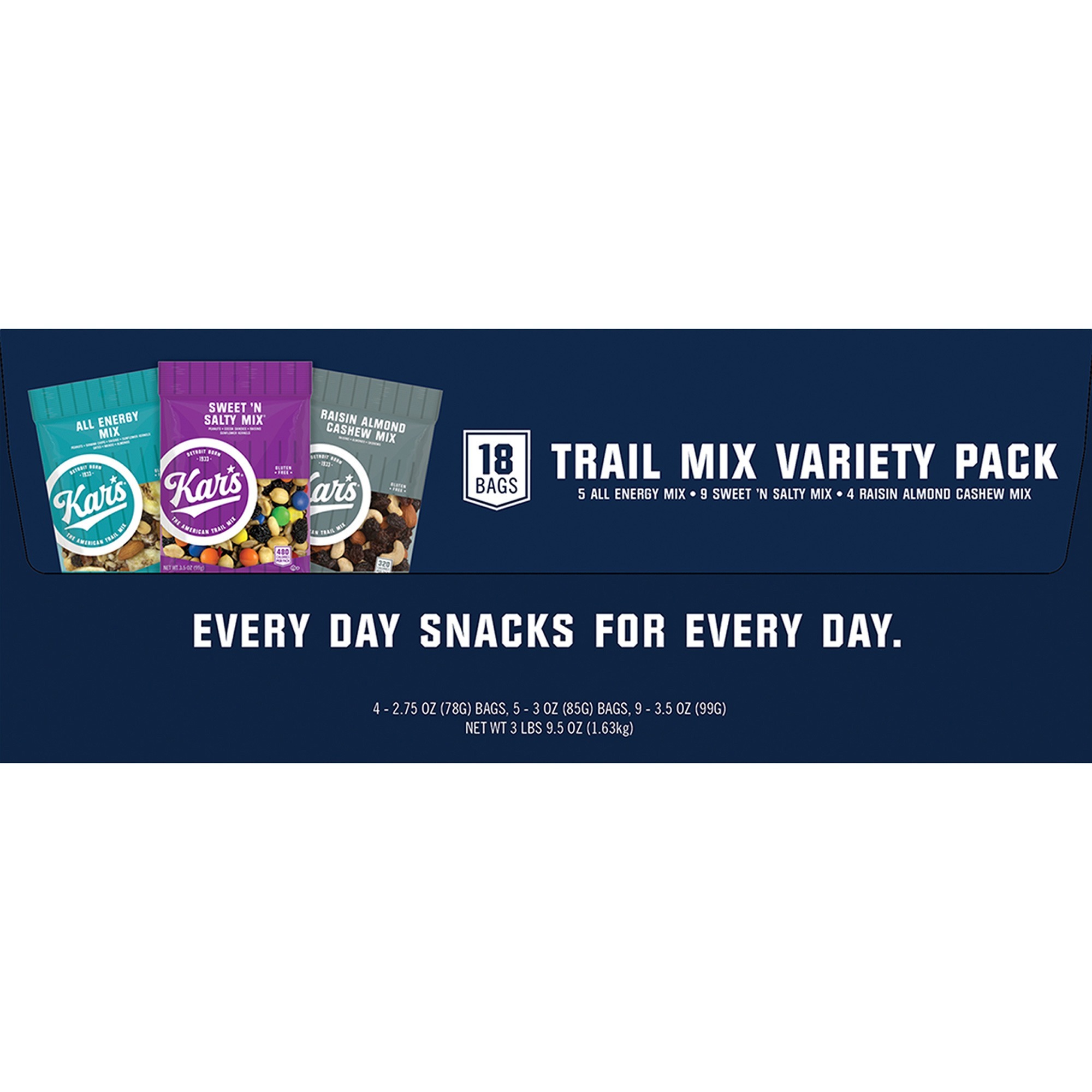 | Marketing Information | <p>Variety pack offers three deliciously enticing trail mixes to keep you satisfied throughout the day. Each bag provides a great source of energy and does not contain any cholesterol or trans fat. Sweet 'n salty mix contains chocolate candies, peanuts, raisins and sunflower kernels. All energy trail mix is packed with an unsalted mix of peanuts, banana chips, raisins, sunflower kernels, almonds, dates and mangos. Raisin almond cashew mix consists of an unsalted blend of raisins, almonds and cashews. Variety pack is perfect for keeping in breakrooms, reception areas and kitchens to boost office morale or impress visitors.</p> |