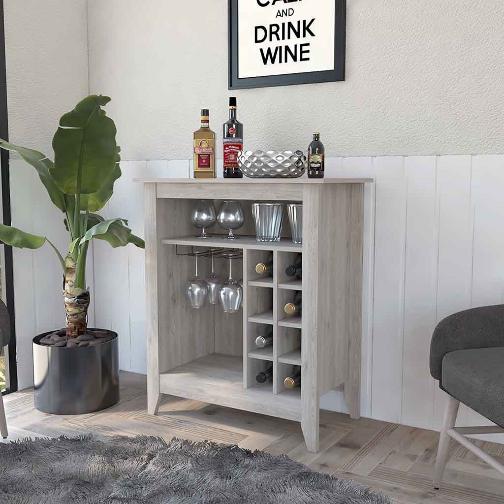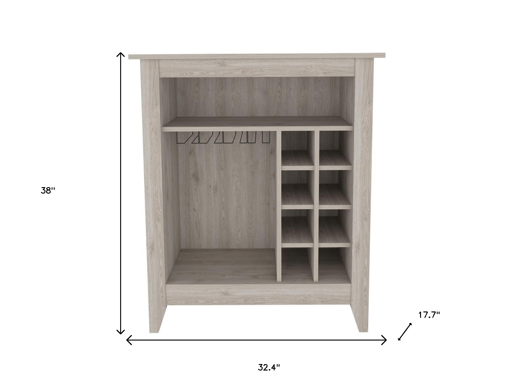 The light gray bar cart with wine storage is a modern addition to your home decor. This stylish bar cart features a cabinet design with an accent cabinet and shelves, providing ample storage space for all your bar essentials. Made from durable particle board, the freestanding bar cart comes in a sleek light gray color that complements any decor. The top and frame of the bar cart are constructed from high-quality manufactured wood. With its wine storage capability, this bar cart can hold up to 8 wine bottles, perfect for entertaining guests. Whether you’re hosting a small gathering or enjoying a quiet evening at home, this bar cart is a functional and stylish choice. 38-inch H x 32.4-inch W x 17.7-inch D
