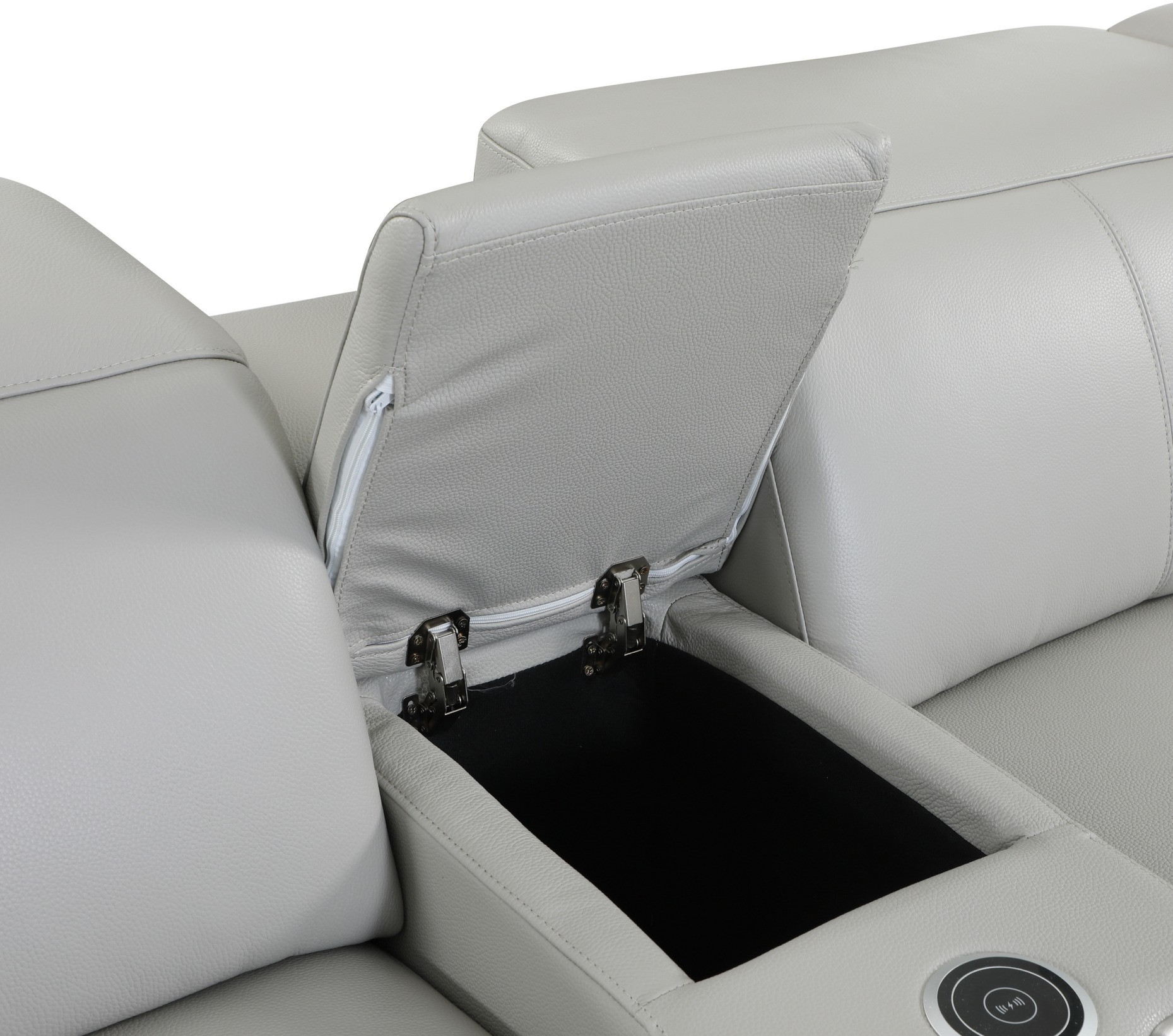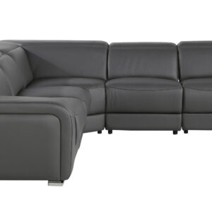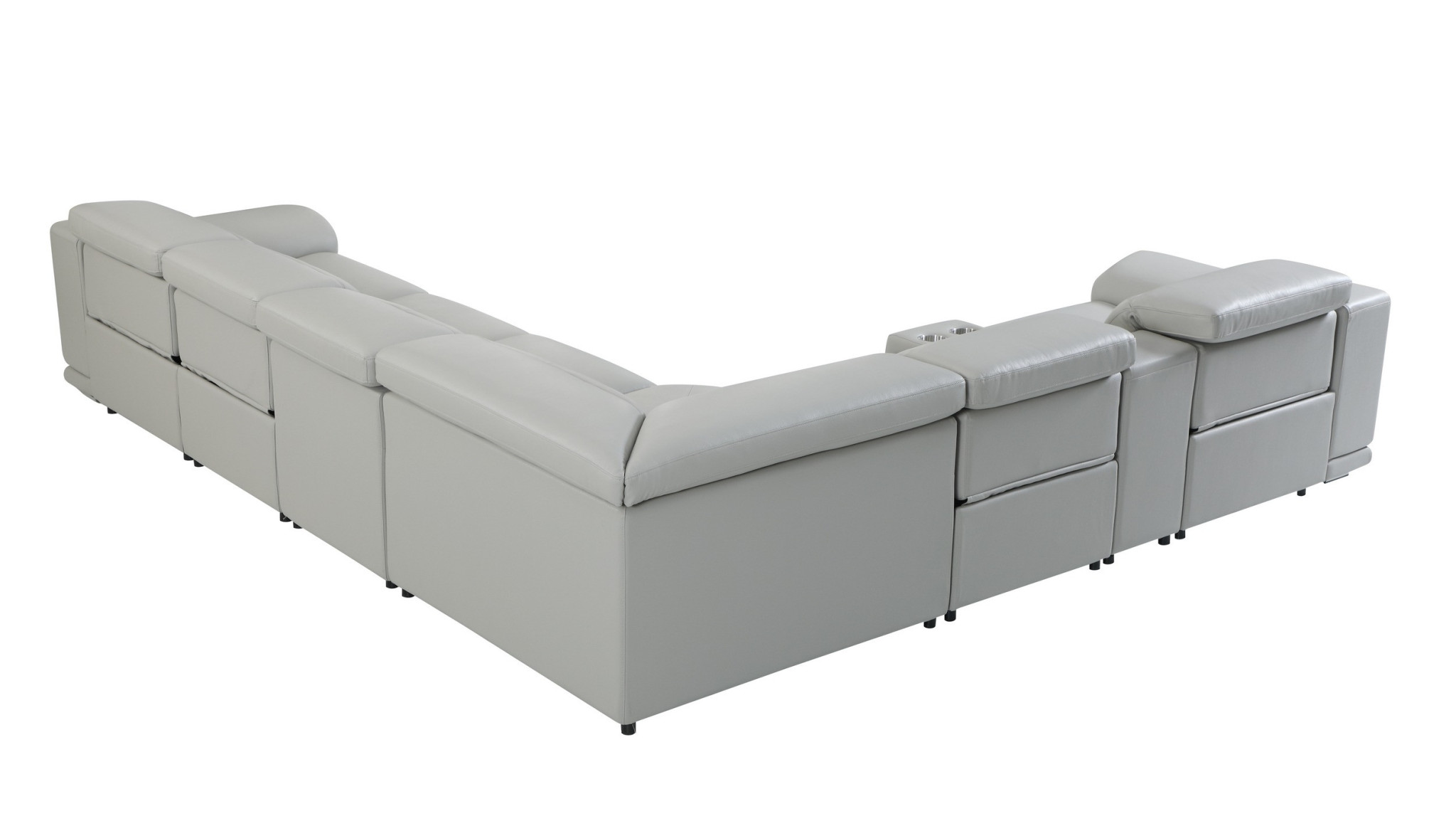 Take your relaxation to the next level with this super soft and comfortable light gray italian leather power reclining u shaped seven piece corner sectional with console. The high-end premium leather used makes your lounging luxuriously comfortable and adds an elegant appeal to your space. Solid colors give you lots of decorative options and are easy to work into your decor scheme. Square arms offer a comfy place to rest. Power – push button recline allows you to truly rest, lounge and even sleep comfortably. Silver metal legs effortlessly elevate the room and add a touch of contemporary design. Features console storage for convenience and to help keep your space tidy. A great showpiece for your room, this sectional is a must have. 35-inch H x 123-inch W x 138-inch D