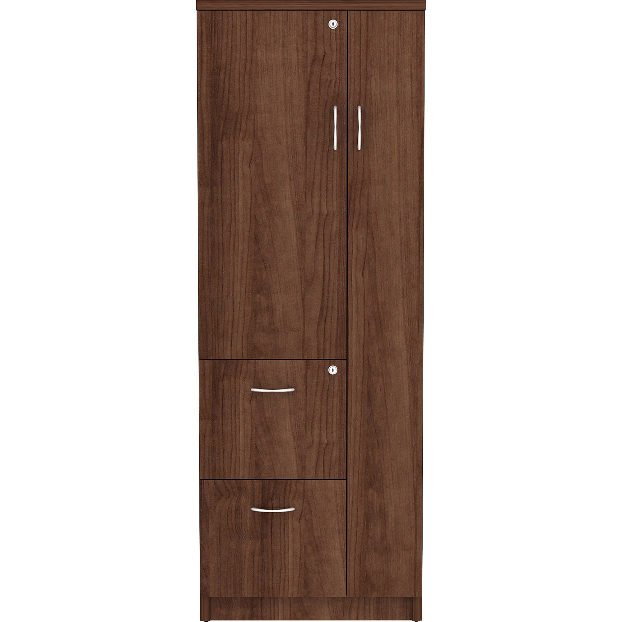 | Marketing Information | Tall storage cabinet is part of Lorell Essentials Series Laminate Furniture with high-quality laminate construction and metal-to-metal, cam-lock connections. Design of the cabinet expands your storage opportunities with the varied sizes of compartments. Full-length compartment on the right features a door to conceal contents. On the left, the half-length compartment includes a locking door and two shelves. The bottom two drawers lock to secure your belongings and hold letter-size files. Durable, Walnut laminate surfaces provide a professional look and are abrasion-resistant. The back is finished on both sides. Cabinet is made of particleboard and medium-density fiberboard. Adjustable levelers help stabilize the cabinet on uneven surfaces. <p><a id="gfk-spex-minisite" rel="nofollow" href="javascript:void(0)" onclick="javascript:window.open('//content.etilize.com/mini-site/en_us/1035845125.html', '_blank', 'height=800, width=780, resizable=yes, scrollbars=yes, toolbar=no, menubar=no, location=no, directories=no, status=no'), return false, ">More from the Manufacturer</a></p> |